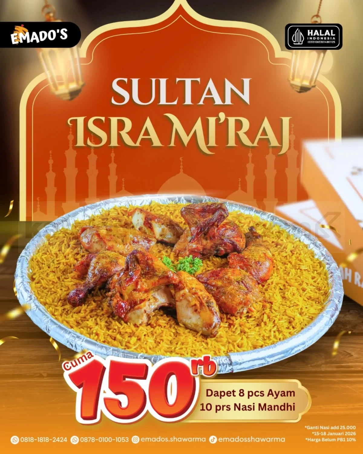 Promo Emado’s Paket Sultan Isra Mi’raj cuma Rp. 150.000 paket 8 ayam dan 10 porsi nasi Mandhi untuk berbagi, berlaku mulai tanggal 15 Januari 2026 – 18 Januari 2026 di seluruh outlet Emado’s.