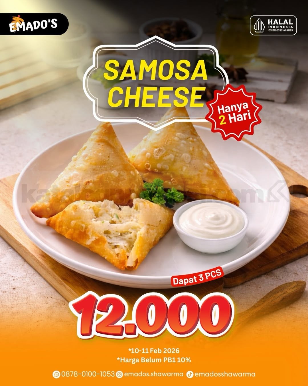 Promo Emado’s Samosa Cheese mulai Rp. 12.000 dapat 3 pcs dengan pembelian dine in atau take away berlaku mulai tanggal 10 Februari 2026 – 11 Februari 2026 di seluruh outlet