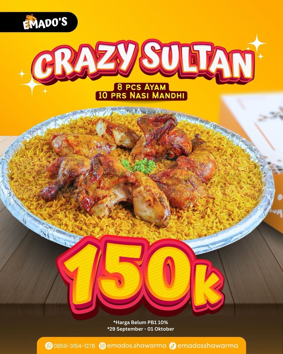 Promo Emados Shawarma Paket Crazy Sultan hadir dengan 8 ayam + 10 nasi mandhi cuma Rp150.000! Berlaku 29 September – 1 Oktober 2025.