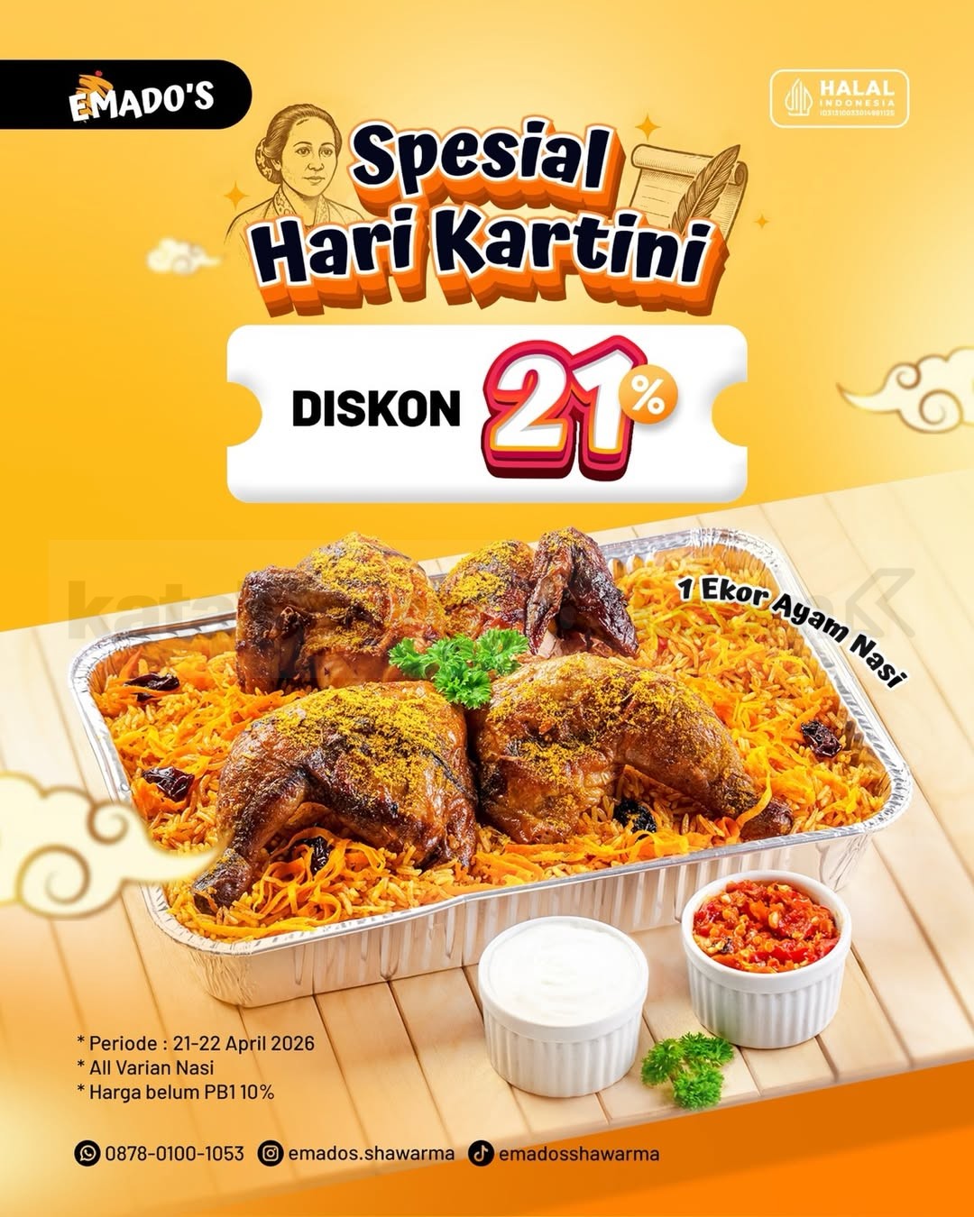 Promo Emado’s Spesial Hari Kartini Diskon 21% untuk Paket 1 ekor Ayam Nasi Mandhi/Kabsah/Biryani berlaku 21 April 2026 – 22 April 2026 di seluruh outlet Emado’s
