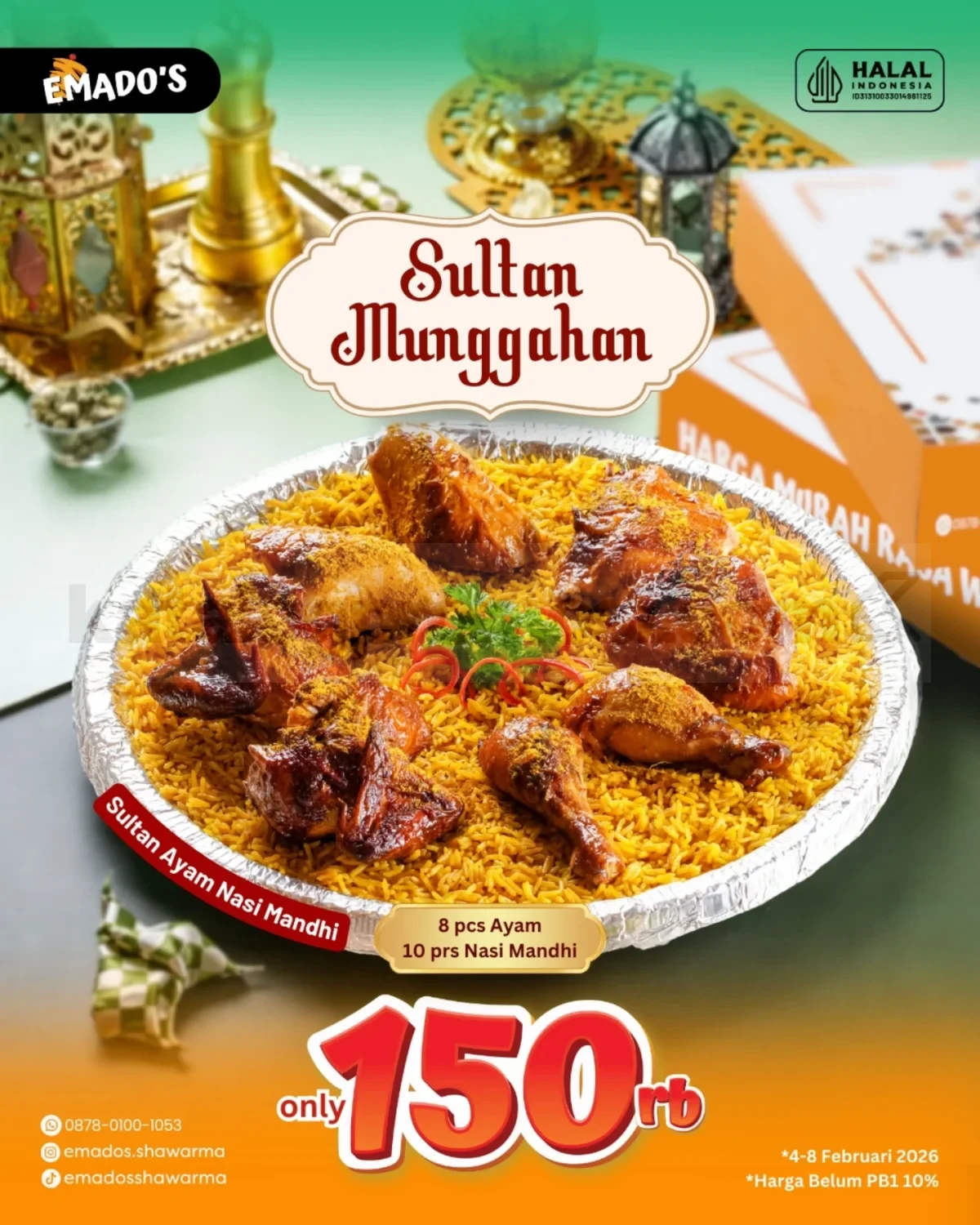 Promo Emados Sultan Munggahan Paket Ayam Panggang Rp. 150.000 menawarkan 8 pcs ayam panggang dan 10 porsi nasi mandhi dengan periode berlaku mulai tanggal 4-8 Februari 2026 di seluruh outlet Emados.