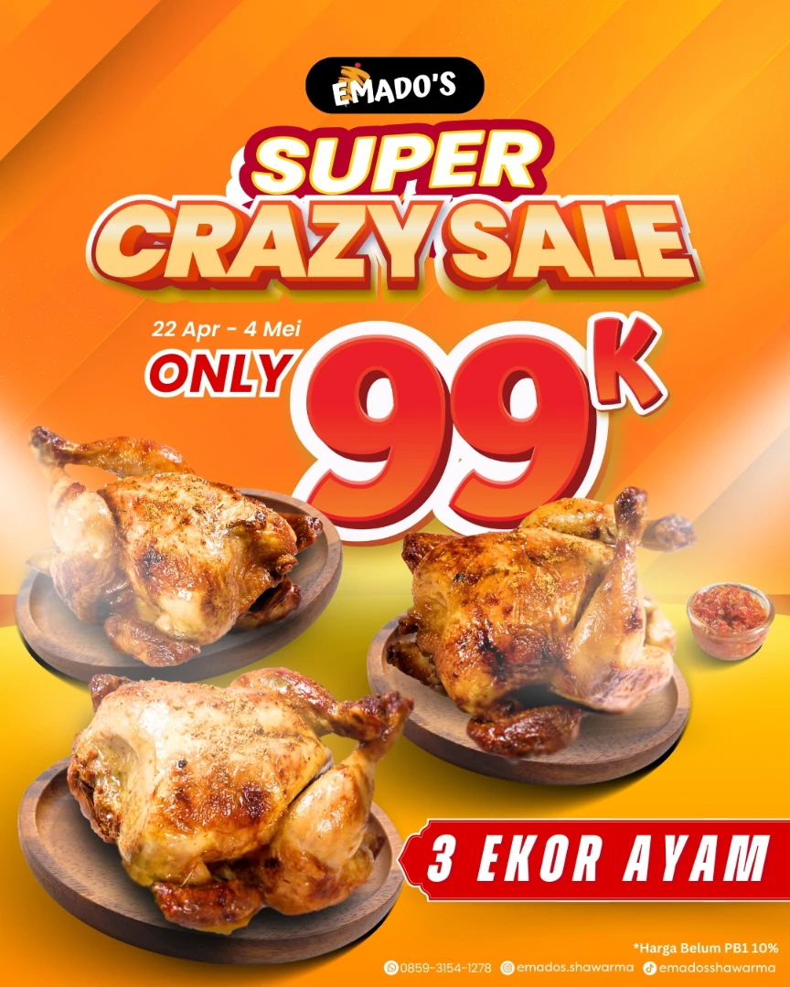 Promo Emados Crazy Sale 3 Ekor Ayam Rp. 99.000 ini bikin momen makan ramean makin hemat dan seru. Yuk langsung pesen paketnya lewat channel favoritmu biar nggak kehabisan selama periode promo berlangsung! 🍗🔥