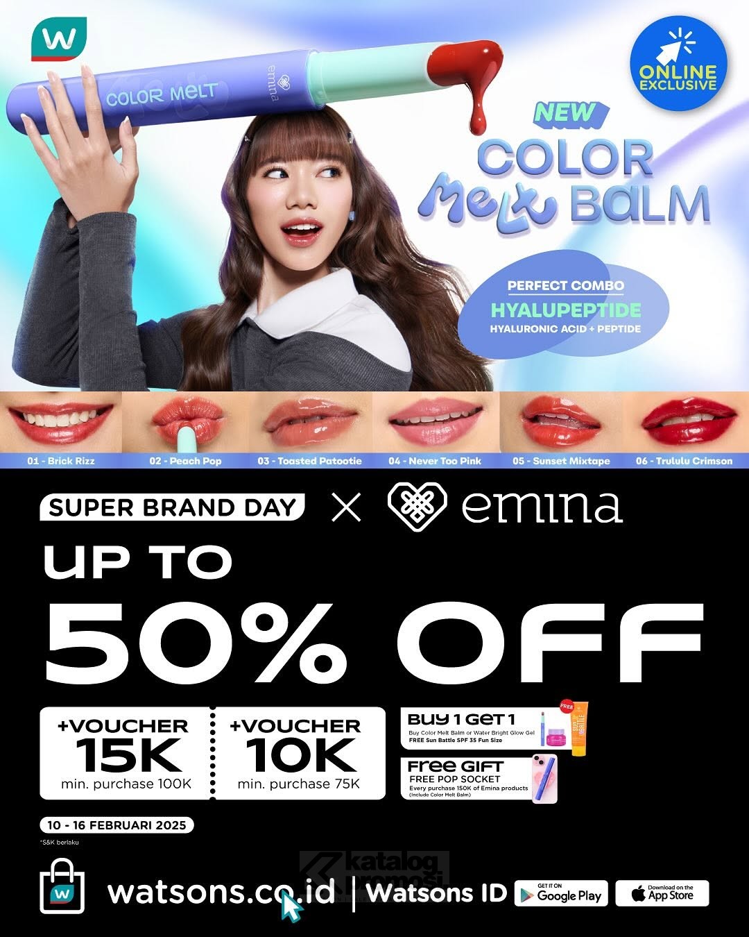 Bulan Februari makin seru dengan Promo Emina di Watsons Super Brand Day! π Jangan lewatkan kesempatan untuk belanja produk kecantikan dan perawatan favoritmu dengan harga super miring selama Watsons Super Brand Day! β¨