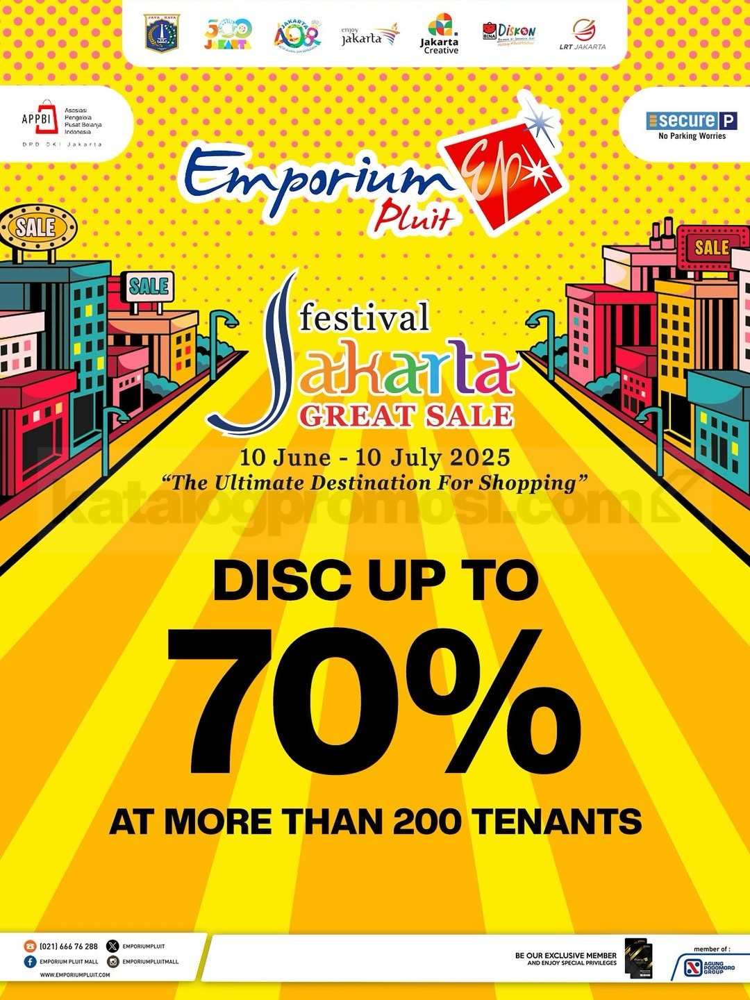 - Diskon hingga 70% hanya berlaku di tenant Emporium Pluit Mall yang berpartisipasi dalam Festival Jakarta Great Sale.