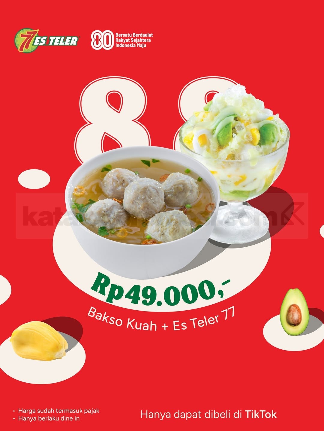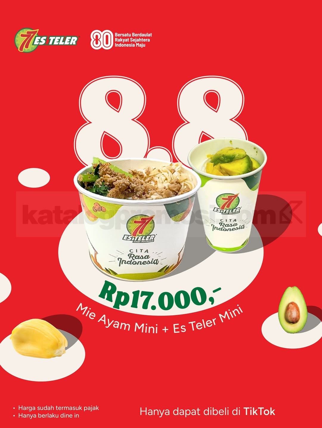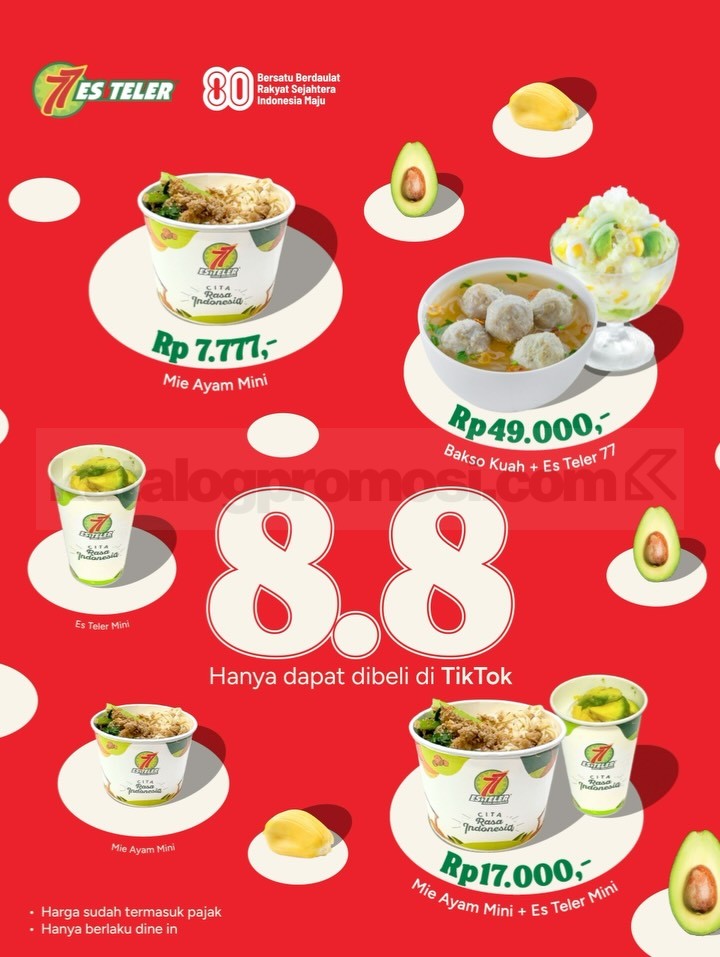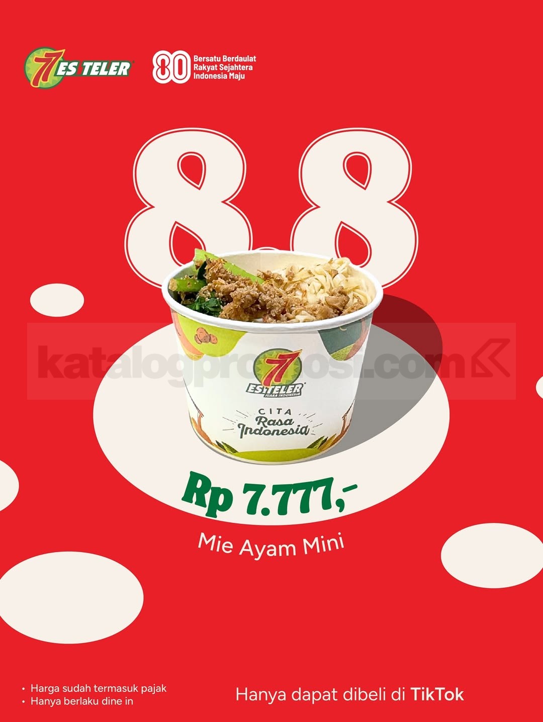 Promo Es Teler 77 8.8 TikTok! Dine-in aja, dapetin Mie Ayam Mini cuma Rp7.777 & paket combo seru lainnya. Berlaku mulai tanggal 8 Agustus 2025.
