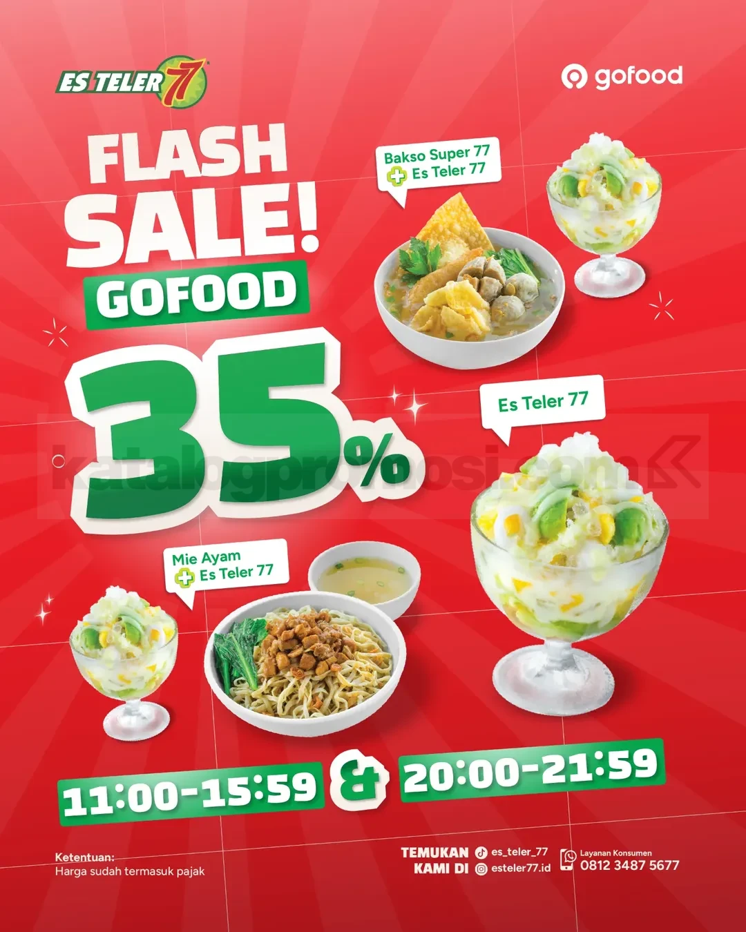 Min Teler mau kasih tau nih, sekarang kamu bisa nikmati promo GoFood Flash Sale Es Teler 77 dengan diskon 35%! 🎉 Menu favorit kamu seperti Bakso Super 77 + Es Teler 77, Es Teler 77, dan Mie Ayam + Es Teler 77 bisa kamu pesan dengan harga super hemat.