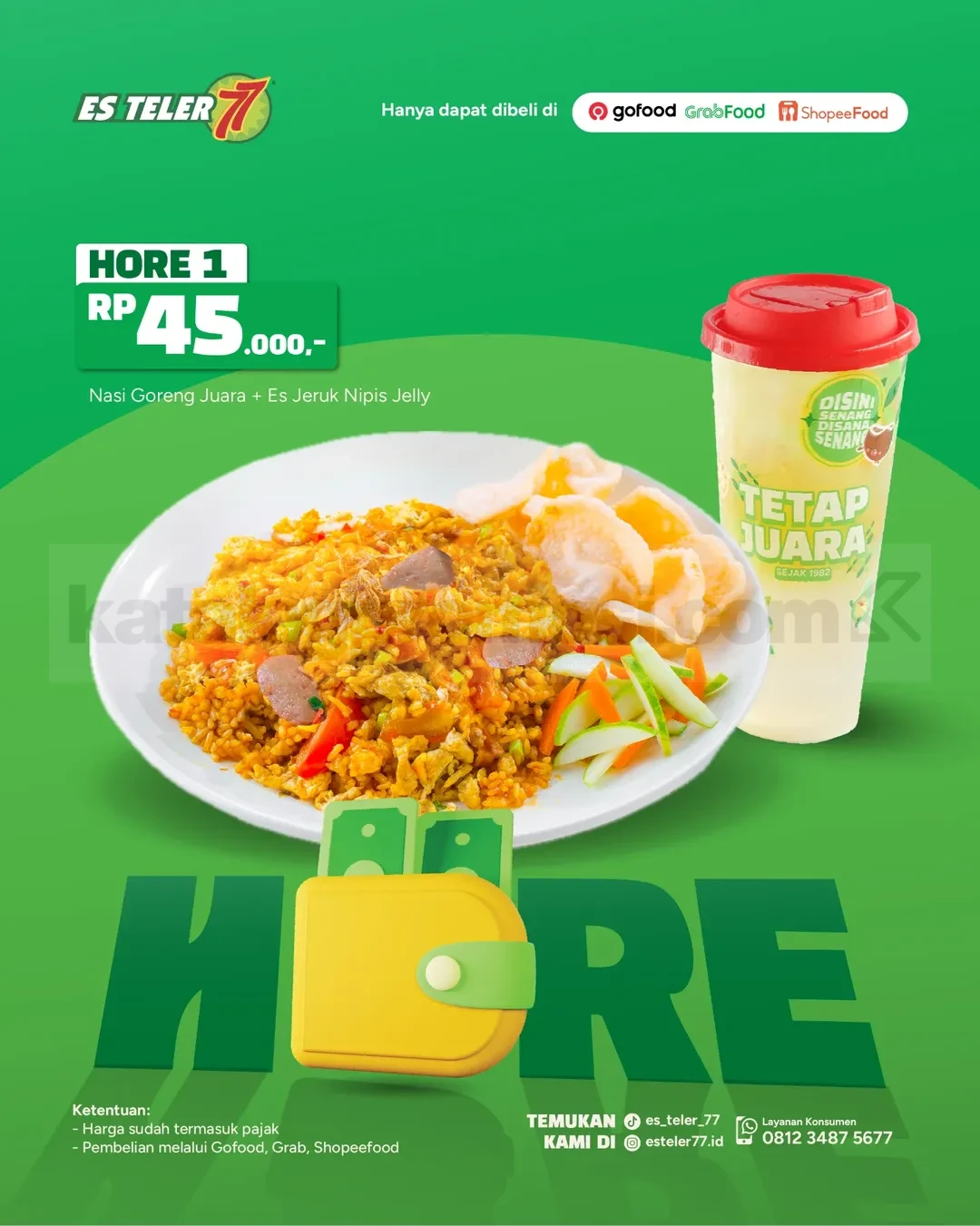 Promo Es Teler 77 Paket Hore 1 hanya Rp. 45.000 berisi nasi goreng juara dan es jeruk nipis jelly untuk pemesanan online delivery, berlaku selama persediaan masih ada.