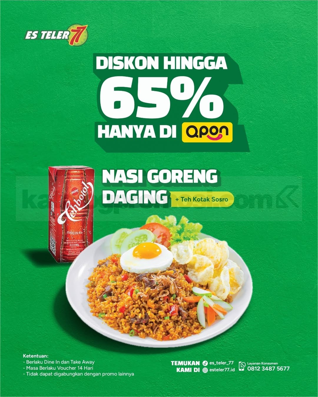 Promo Es Teler 77 QPON Voucher Diskon Hingga 65% untuk Nasi Goreng Daging + Teh Kota Sosro, berlaku 14 hari untuk dine in & take away.