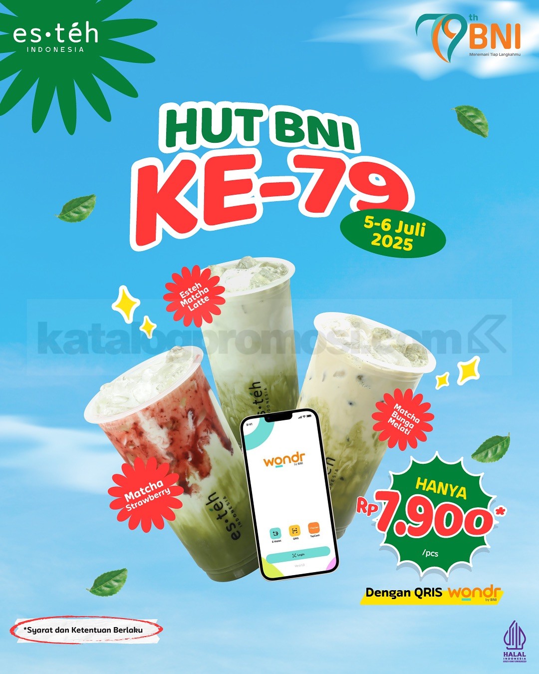 Promo Esteh Indonesia HUT BNI 79! Matcha Series ukuran large cuma Rp7.900 pakai QRIS wondr by BNI, berlaku di outlet terdaftar 5–6 Juli 2025