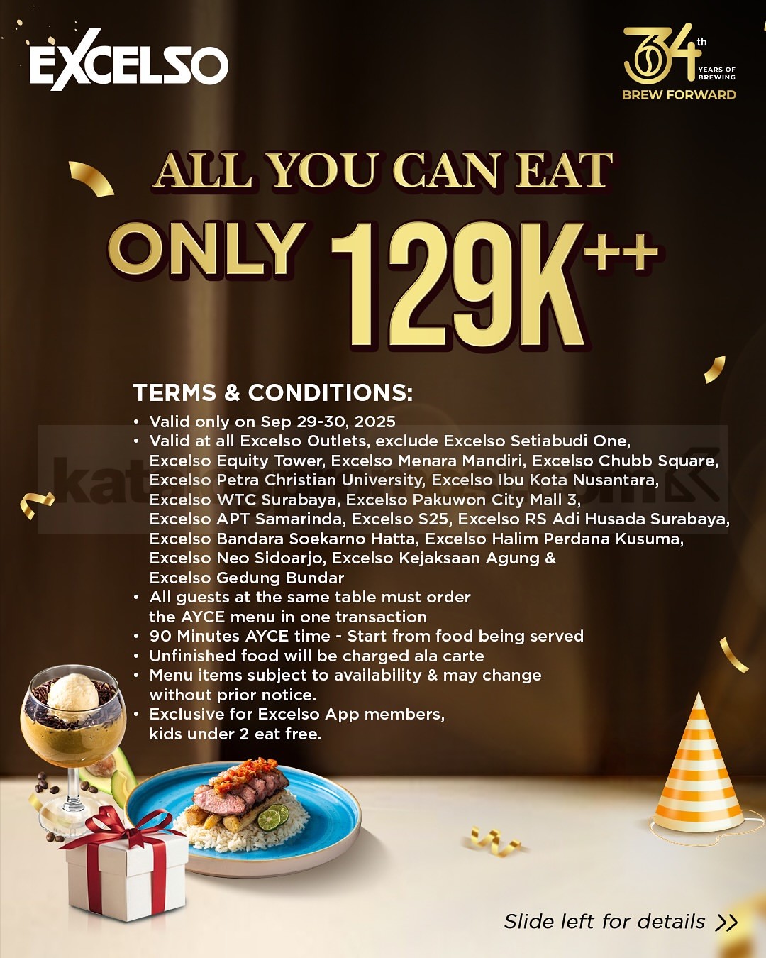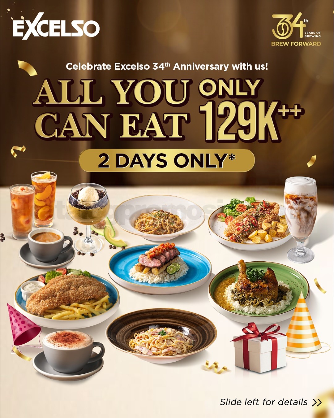 Woohooo! Excelso ulang tahun ke-34 🎉 Saatnya rayakan dengan promo spesial All You Can Eat cuma Rp129 ribuan aja per orang. Kapan lagi bisa makan menu Excelso sepuasnya dengan harga hemat?