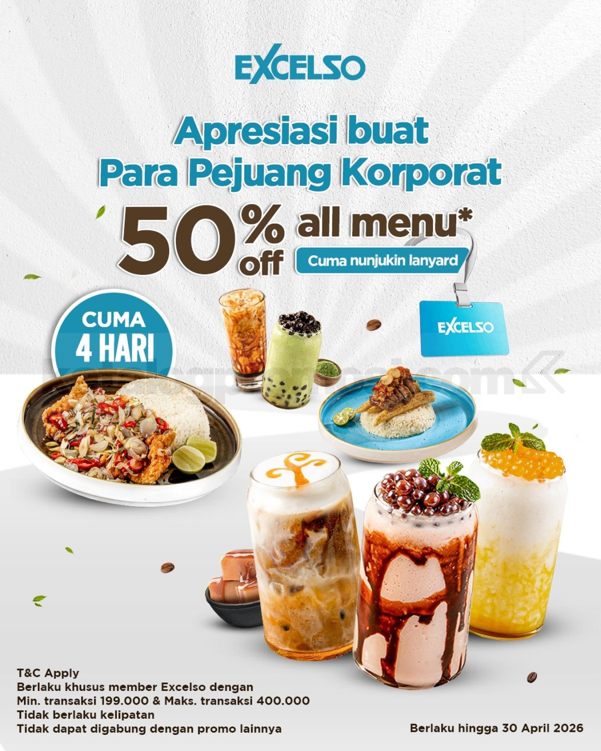 Promo Excelso Diskon 50% all menu dengan tunjukkan lanyard dan min transaksi Rp. 199.000 berlaku mulai tanggal 27 April 2026 – 30 April 2026 di seluruh outlet.