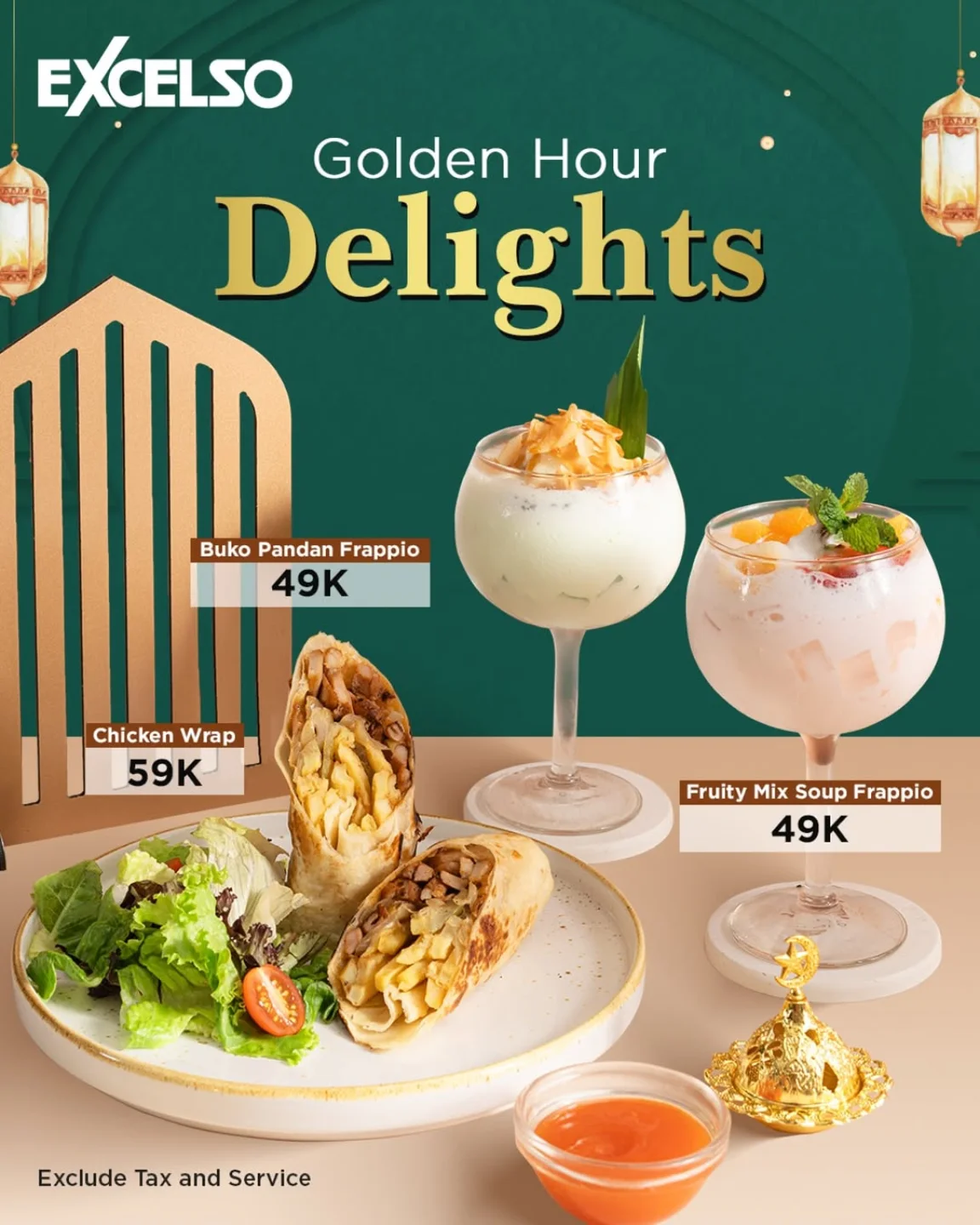 Promo Excelso Golden Hour Delights! Buka puasa dengan Buko Pandan Frappio, Fruity Mix Soup Frappio, & Chicken Wrap mulai Rp. 49.000. Berlaku selama Ramadan!