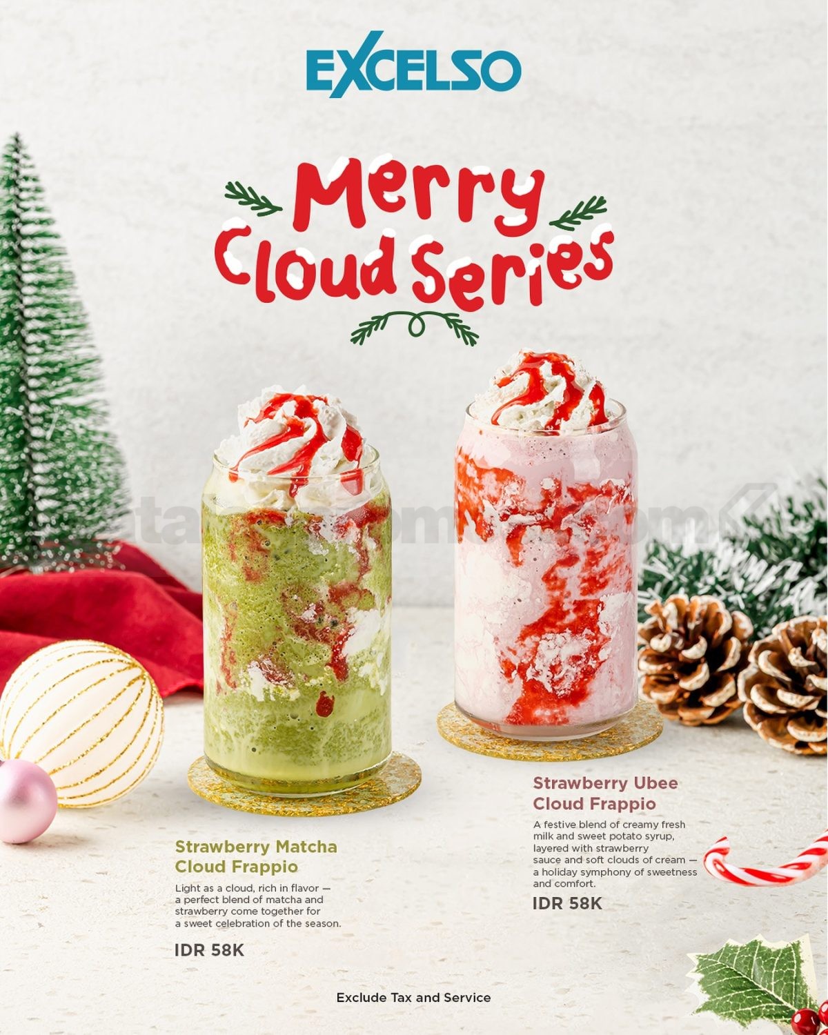 Saatnya manjain diri dengan Promo Excelso Merry Cloud Series yang super creamy dan segar. Nikmati kombinasi unik antara ubee & matcha yang lembut, dikombinasi dengan krim manis dan strawberry segar.