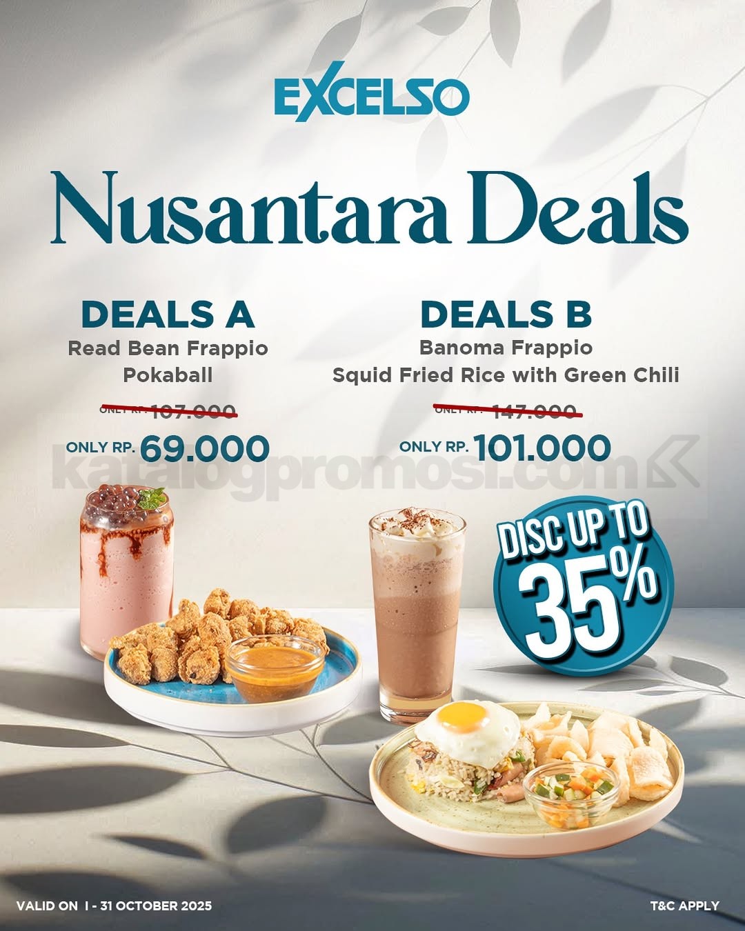 Promo Excelso Paket Nusantara Deals Diskon Hingga 35% berlaku selama Oktober 2025. Dapatkan Red Bean Frappio, Pokaball, dan Squid Fried Rice mulai Rp 69.000!