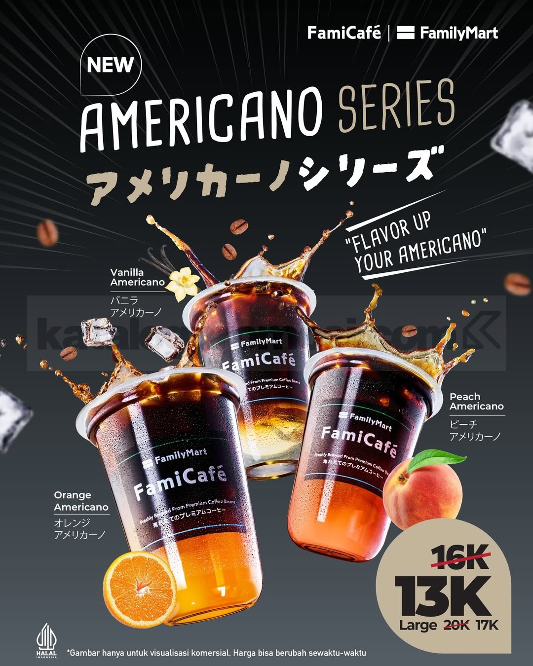 👉 Cek gambar Promo FamiCafé New! Americano Series Mulai Rp.13.000 di bawah ini untuk lihat tiga varian rasa dan harga spesialnya!