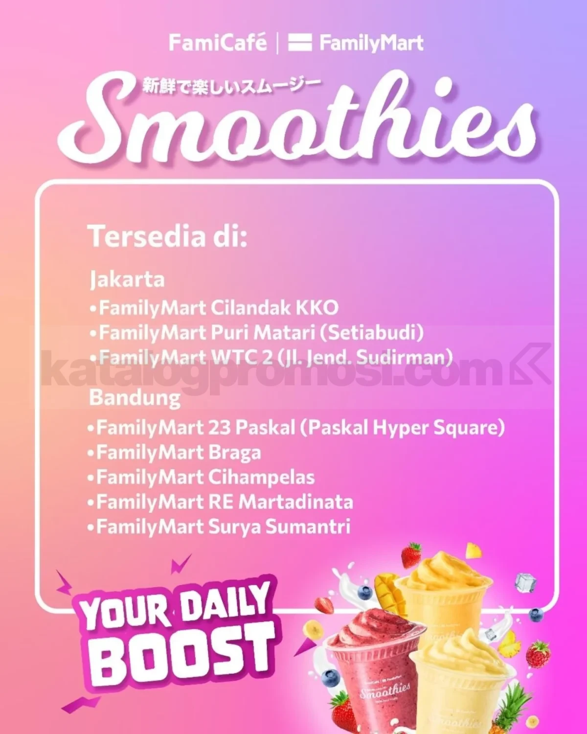 - Smoothies tersedia di outlet FamilyMart tertentu di Jakarta dan Bandung.