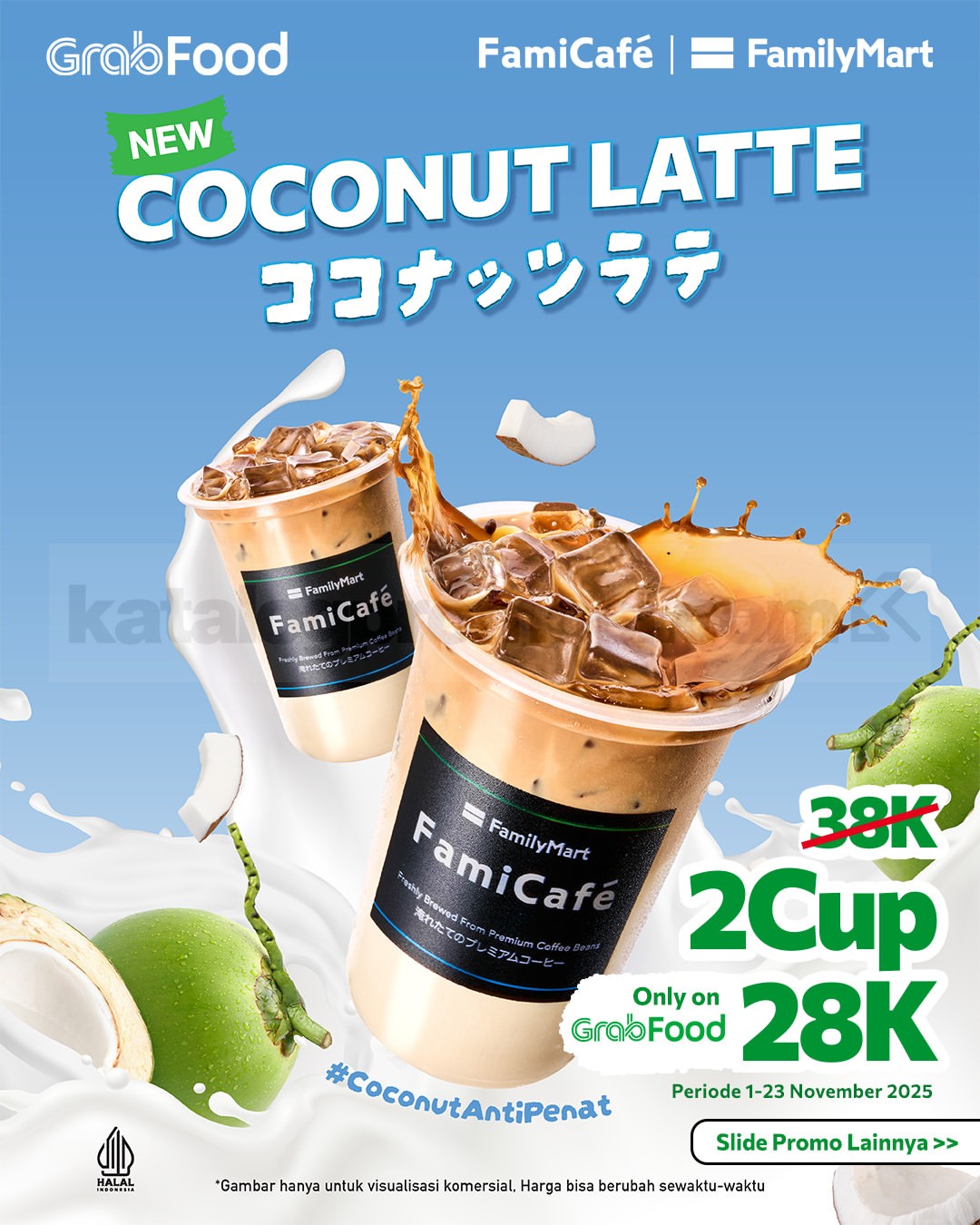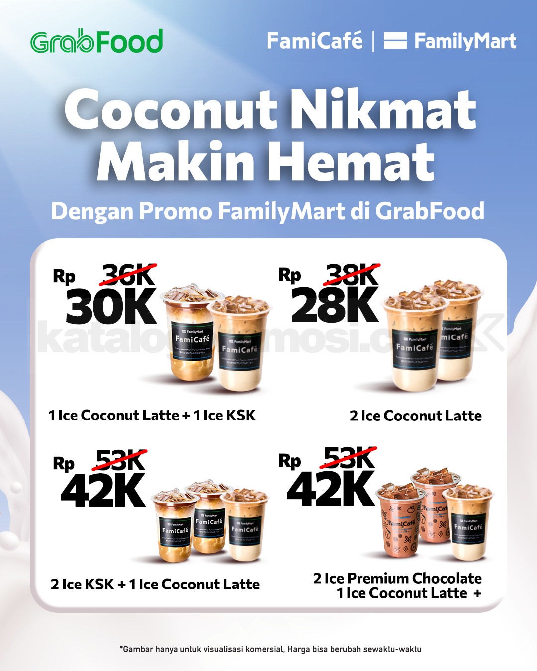 Promo FAMILYMART GrabFood Coconut Nikmat Makin Hemat mulai Rp. 28.000, nikmati paket Coconut Latte, KSK, dan Premium Chocolate, berlaku 1–23 November 2025