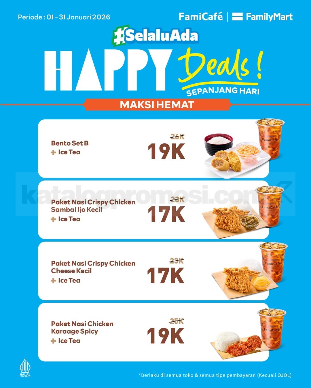 Promo FamilyMart Paket Maksi Hemat mulai Rp. 17.000 dengan pilihan menu makan siang dan ice tea, mekanisme beli langsung di toko, berlaku mulai tanggal 1 Januari 2026 – 31 Januari 2026 di seluruh outlet.