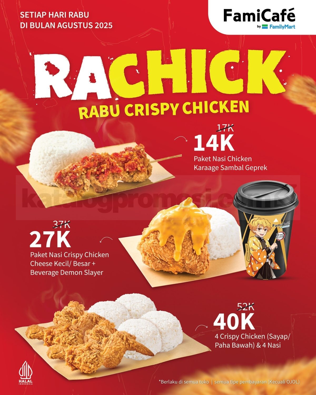 👉 Cek gambar promo FamilyMart Rachick Rabu Crispy Chicken mulai Rp.15.000 di bawah ini untuk lihat daftar paket dan harga lengkap, termasuk bonus Collectible Card di paket tertentu.