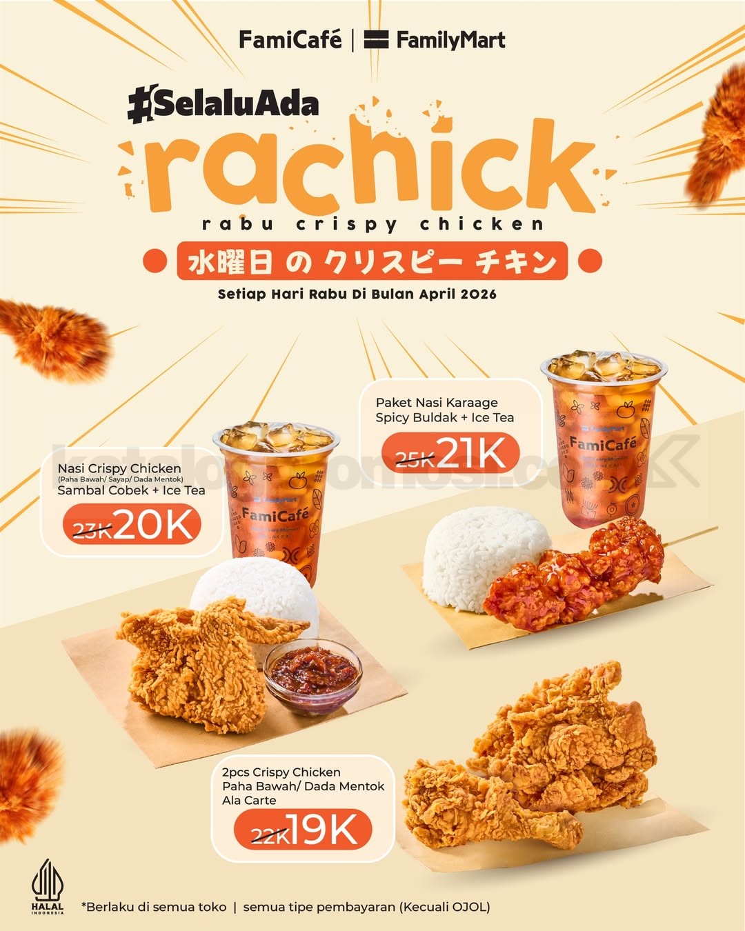 Promo FamilyMart RACHICK Rabu Crispy Chicken mulai Rp. 19.000 paket hemat dengan ice tea, berlaku setiap hari Rabu selama bulan April 2026 di seluruh outlet