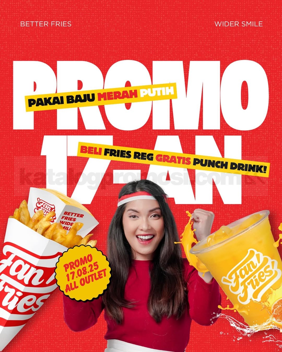 Momen 17 Agustus makin seru dengan Promo Fan Fries Merdeka! ๐ฅณ Buat yang suka ngemil sambil ngerayain vibes kemerdekaan, kamu bisa dapetin FREE Punch Drink pas beli Fries ukuran reguler di semua outlet Fan Fries. Cuma perlu datang tanggal 17 Agustus 2025, pakai outfit merah putih, beli Fries ukuran reguler apa aja ๐, dan langsung bawa pulang minuman segar gratis ๐ฅค. Simpel banget kan? Yuk, rayain kemerdekaan dengan cara paling crunchy dan fresh! โค๏ธ๐ค
