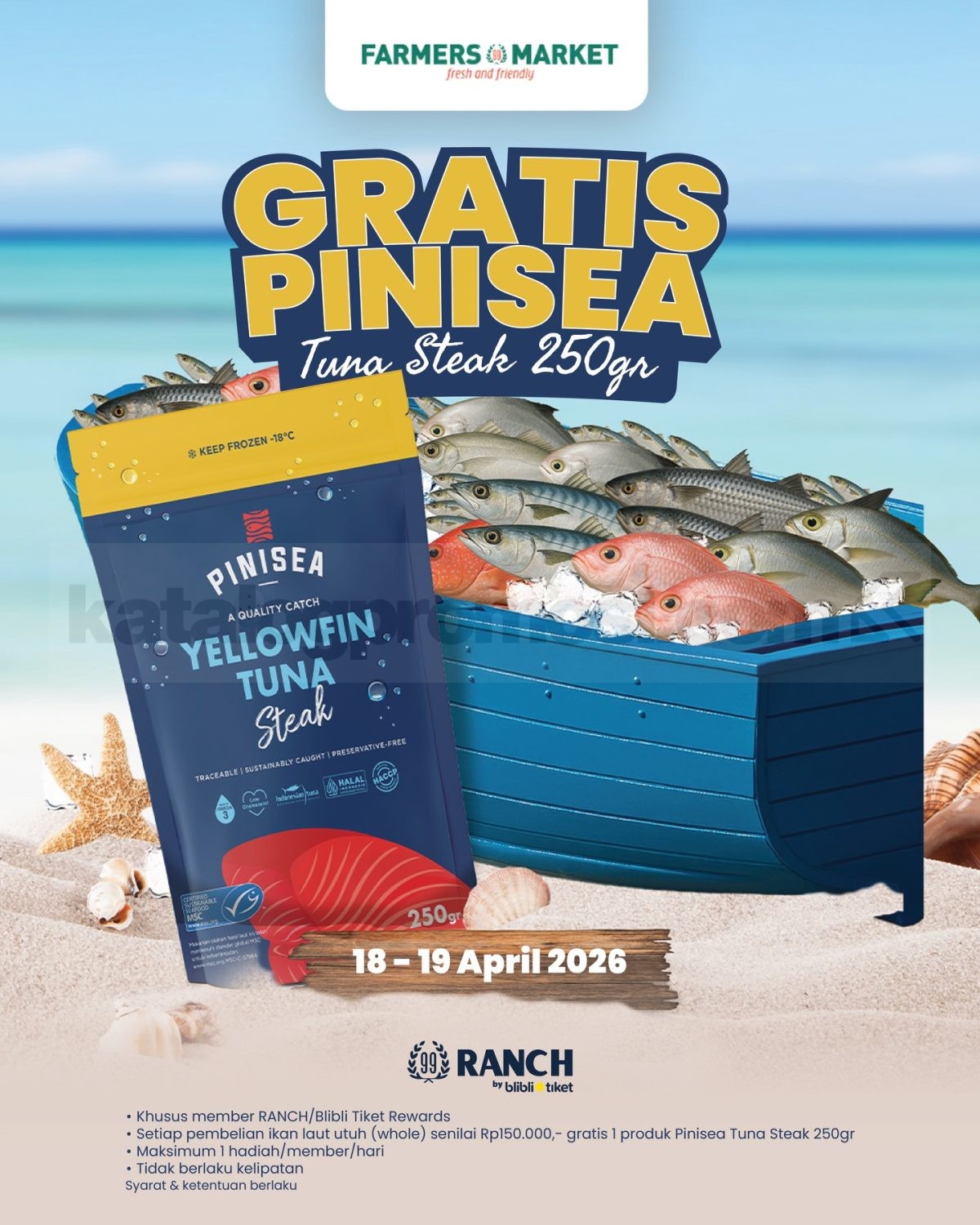 Promo Farmers Market Gratis Pinisea Tuna Steak 250gr periode 18 – 19 April 2026 gratis 1 produk setelah pembelian ikan laut utuh min Rp. 150.000 khusus member RANCH Blibli Tiket Rewards di Farmers Market.