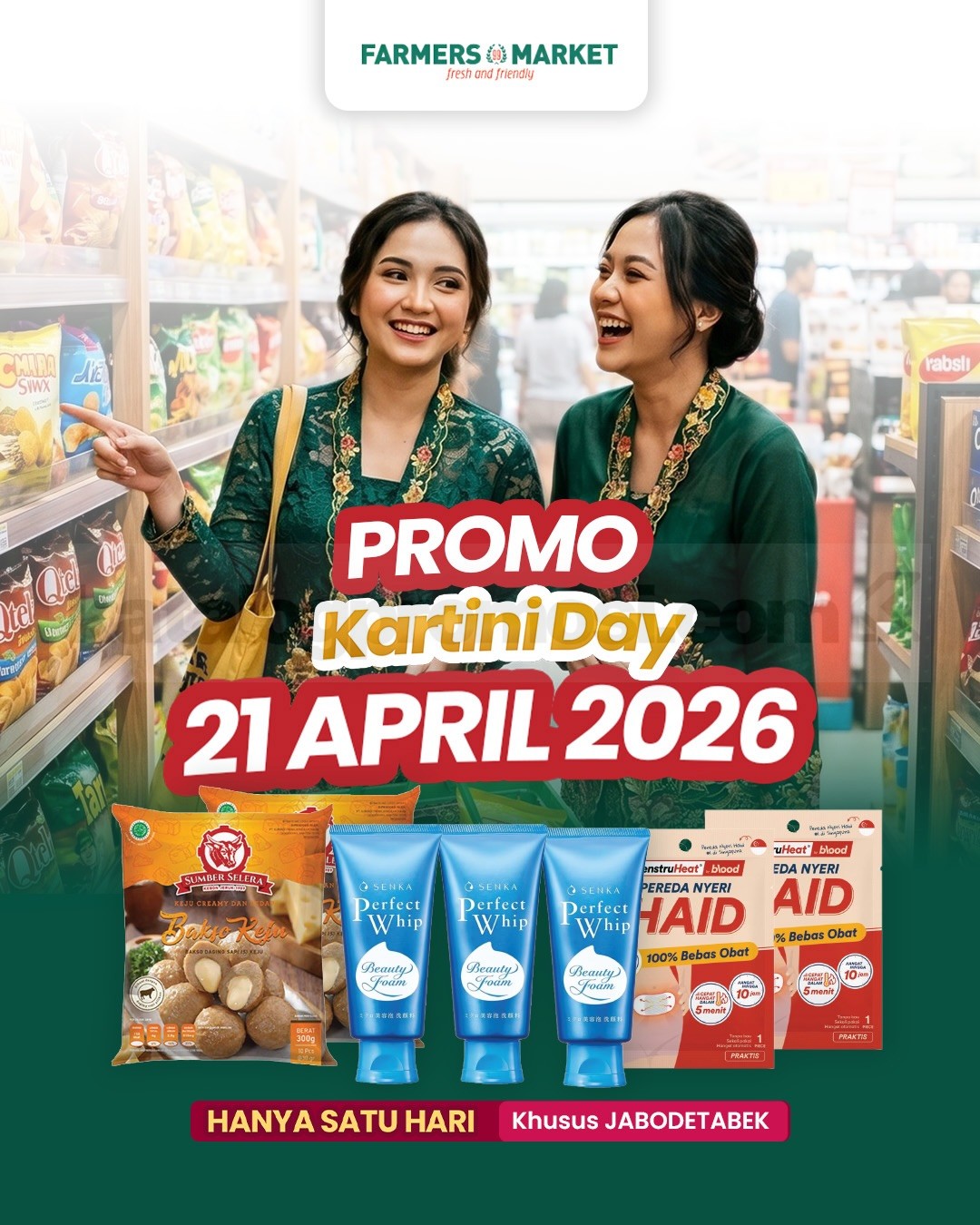 Promo berlaku tanggal 21 April 2026 khusus area JABODETABEK di Farmers Market selama periode program Kartini Day berlangsung sesuai ketentuan promo kategori produk yang tersedia di outlet wilayah program.
