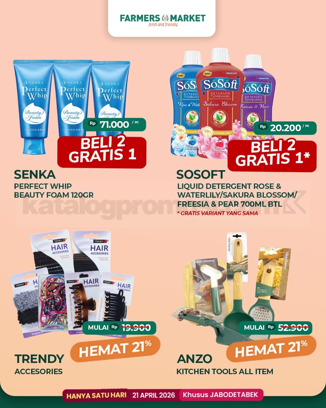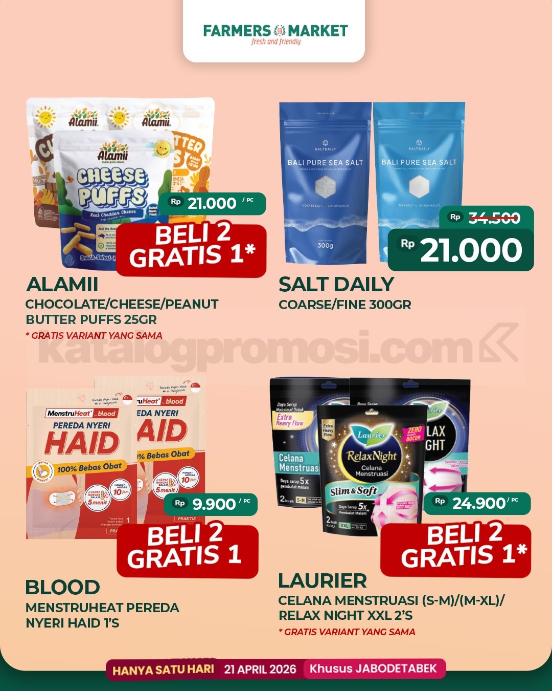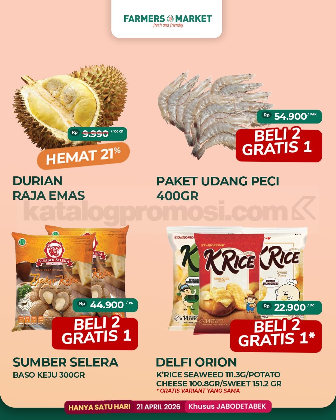 Promo tersedia tanggal 21 April 2026 mengikuti jam operasional outlet Farmers Market area JABODETABEK selama periode program berlangsung.