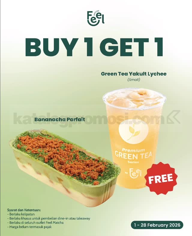 Promo Feel Matcha Buy 1 Get 1 beli Bananacha Parfait GRATIS Green Tea Yakult Lychee Small berlaku mulai tanggal 1 – 28 Februari 2026 di seluruh outlet.