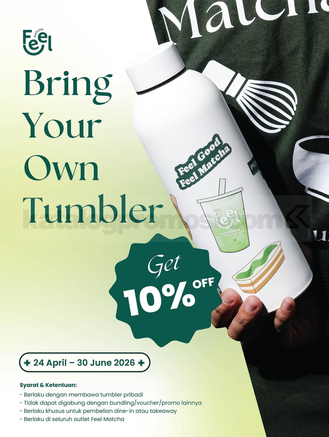 Promo ini berlaku mulai 24 April 2026 sampai 30 Juni 2026 dan bisa kamu nikmati di seluruh outlet Feel Matcha. Pastikan kamu selalu ingat bawa tumbler favoritmu biar nggak ketinggalan benefitnya!