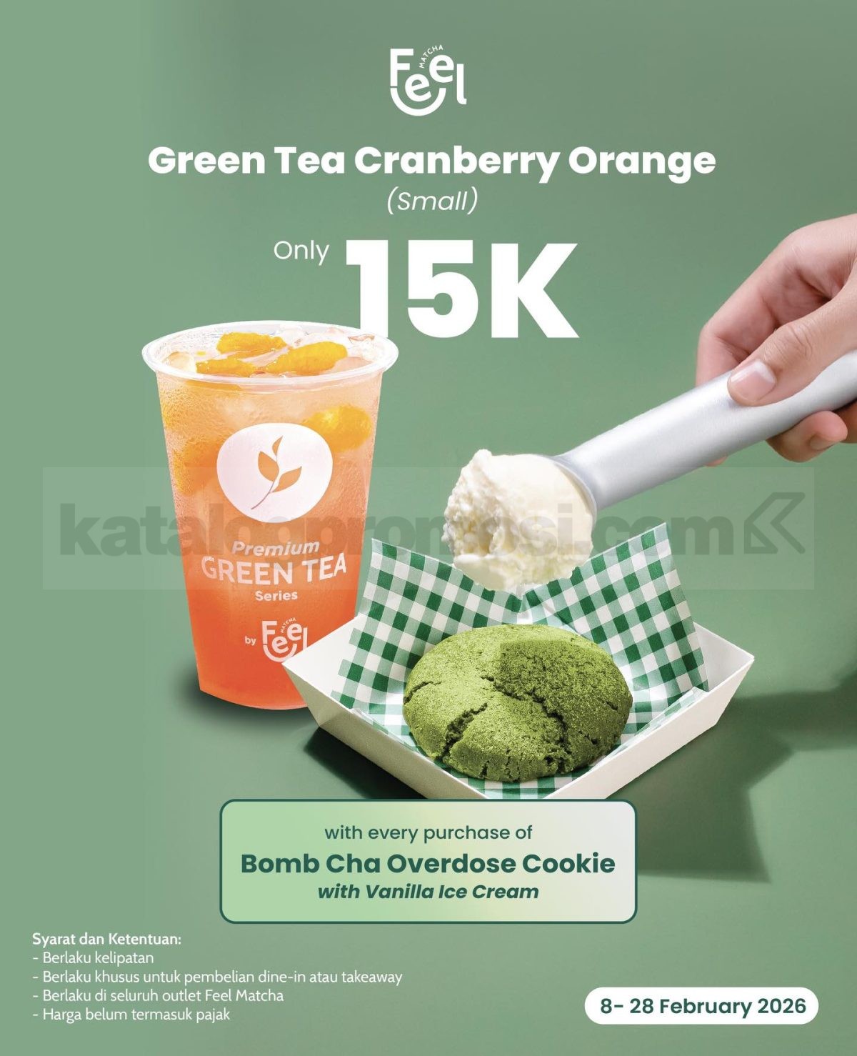 Promo Feel Matcha Green Tea Cranberry Orange Rp. 15.000 menawarkan minuman segar dengan harga spesial lewat pembelian cookie dan es krim, berlaku mulai tanggal 8-28 Februari 2026 di seluruh outlet.