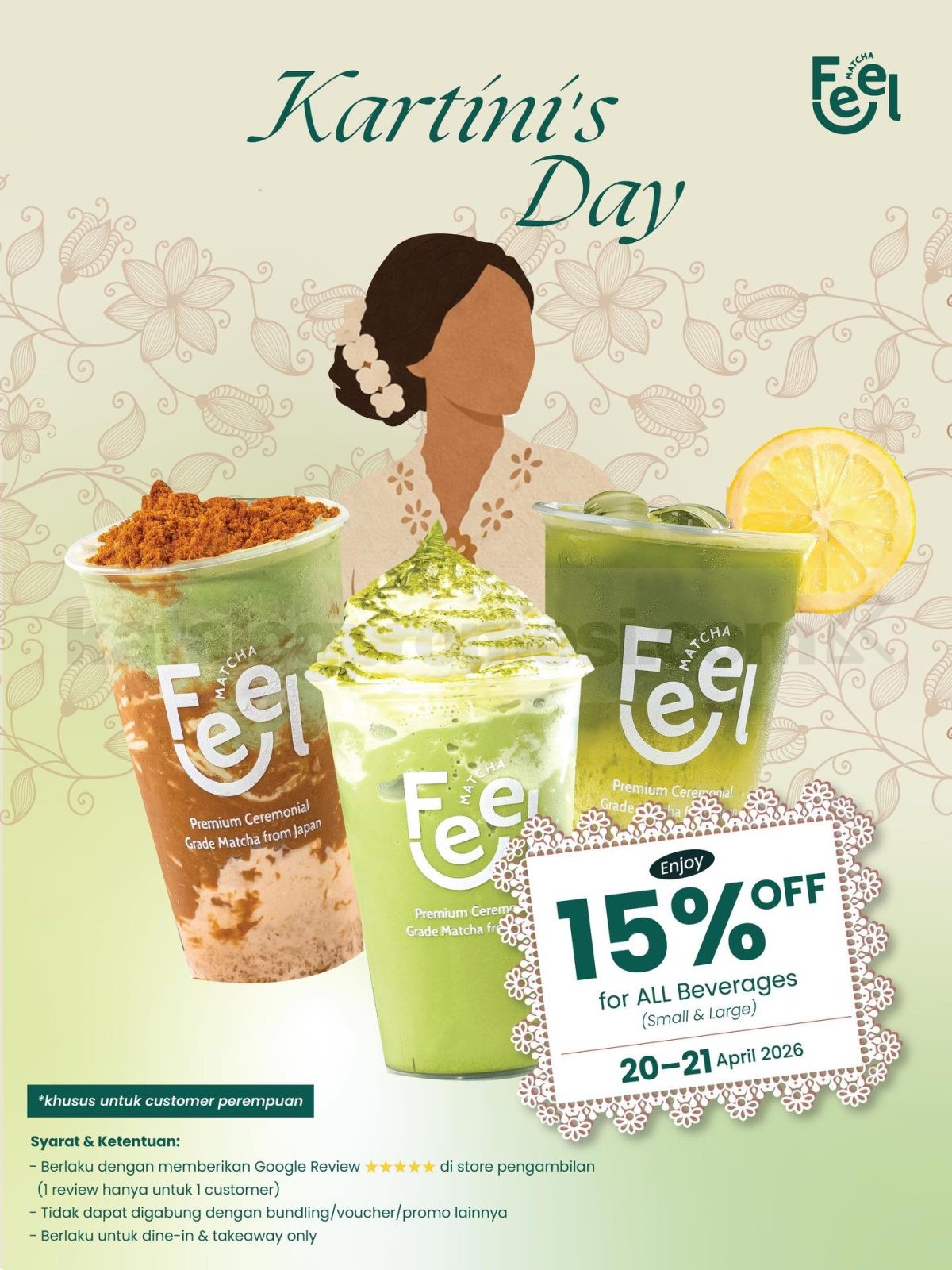 Promo Feel Matcha Kartini Day Diskon 15% Semua Minuman untuk ukuran small & large dengan Google Review berlaku mulai tanggal 20 April 2026 – 21 April 2026.