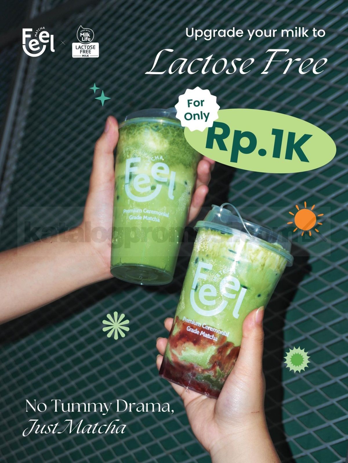 Promo Feel Matcha Upgrade Lactose Free +Rp. 1.000 berlaku sampai 30 Juni 2026 untuk penggantian susu reguler ke lactose free milk @milklife.id pada menu matcha selama periode program berjalan di outlet Feel Matcha. Opsi upgrade ini relevan untuk pembelian minuman matcha harian sampai akhir Juni 2026 selama varian susu tersedia.