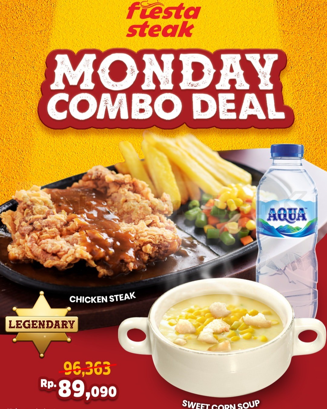 Promo Fiesta Steak Monday Combo Deal! Diskon Rp 8.000 buat combo chicken steak + soup + Aqua jadi Rp 89.090. Berlaku s.d 27 Oktober 2025