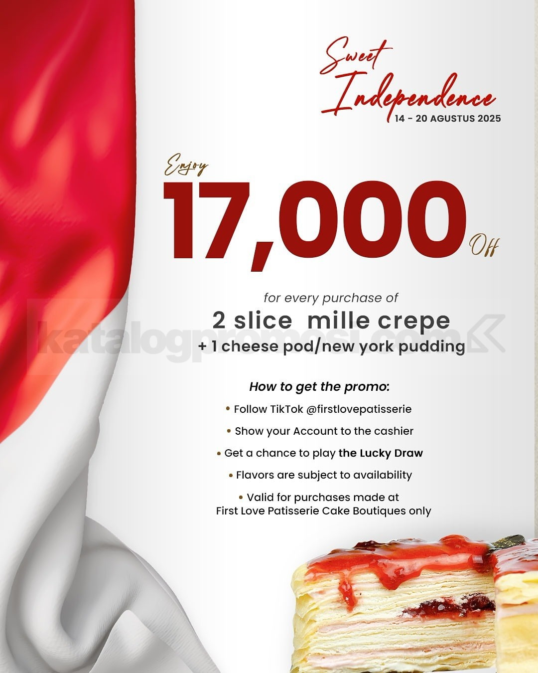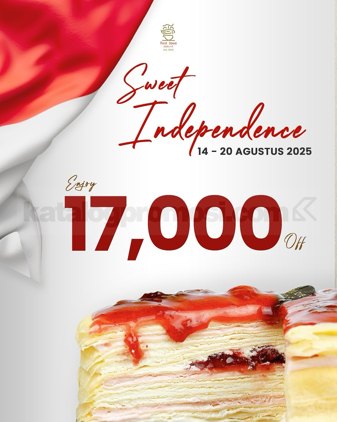 Promo Sweet Independence First Love Patisserie! Diskon Rp17.000 untuk 2 slice mille crepe + cheese pod/pudding. 14โ20 Agustus 2025.