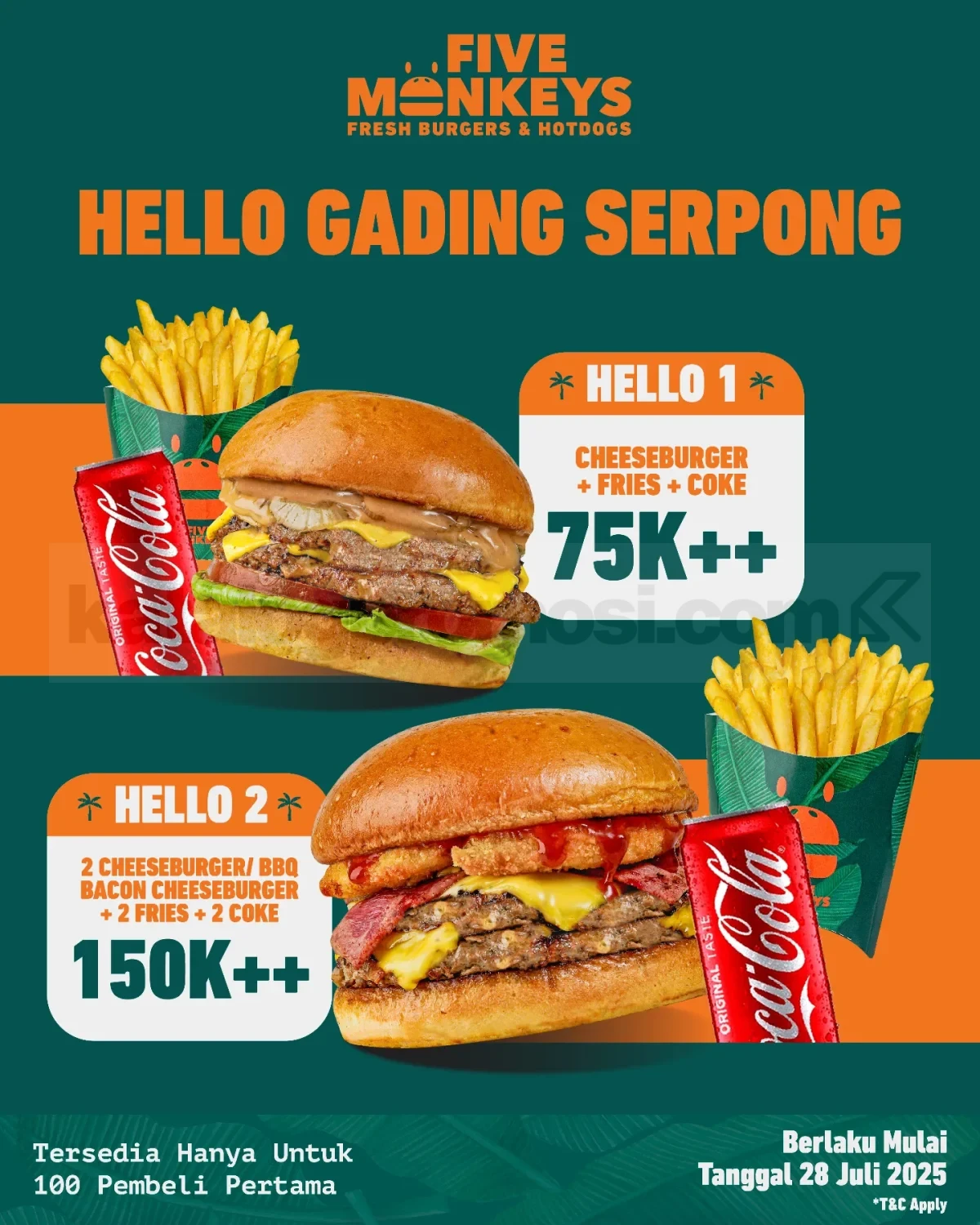 Langsung mampir ke Five Monkeys Burger DP Mall Semarang dan sikat Promo Five Monkeys Burger Free 1 Single Burger sebelum kehabisan! Ajak teman dan nikmati 3 burger dengan harga cuma 2—hemat banget, kenyang banget! 🍔🔥✨