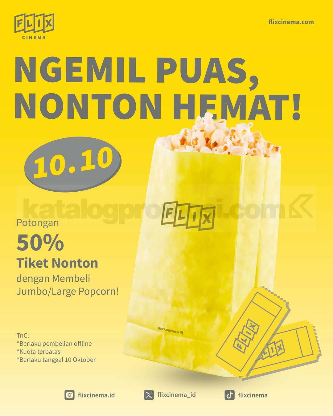 Promo FLIX Cinema 10.10 Diskon 50% Tiket Nonton dengan beli popcorn jumbo/large berlaku 10 Oktober 2025 dengan kuota terbatas.