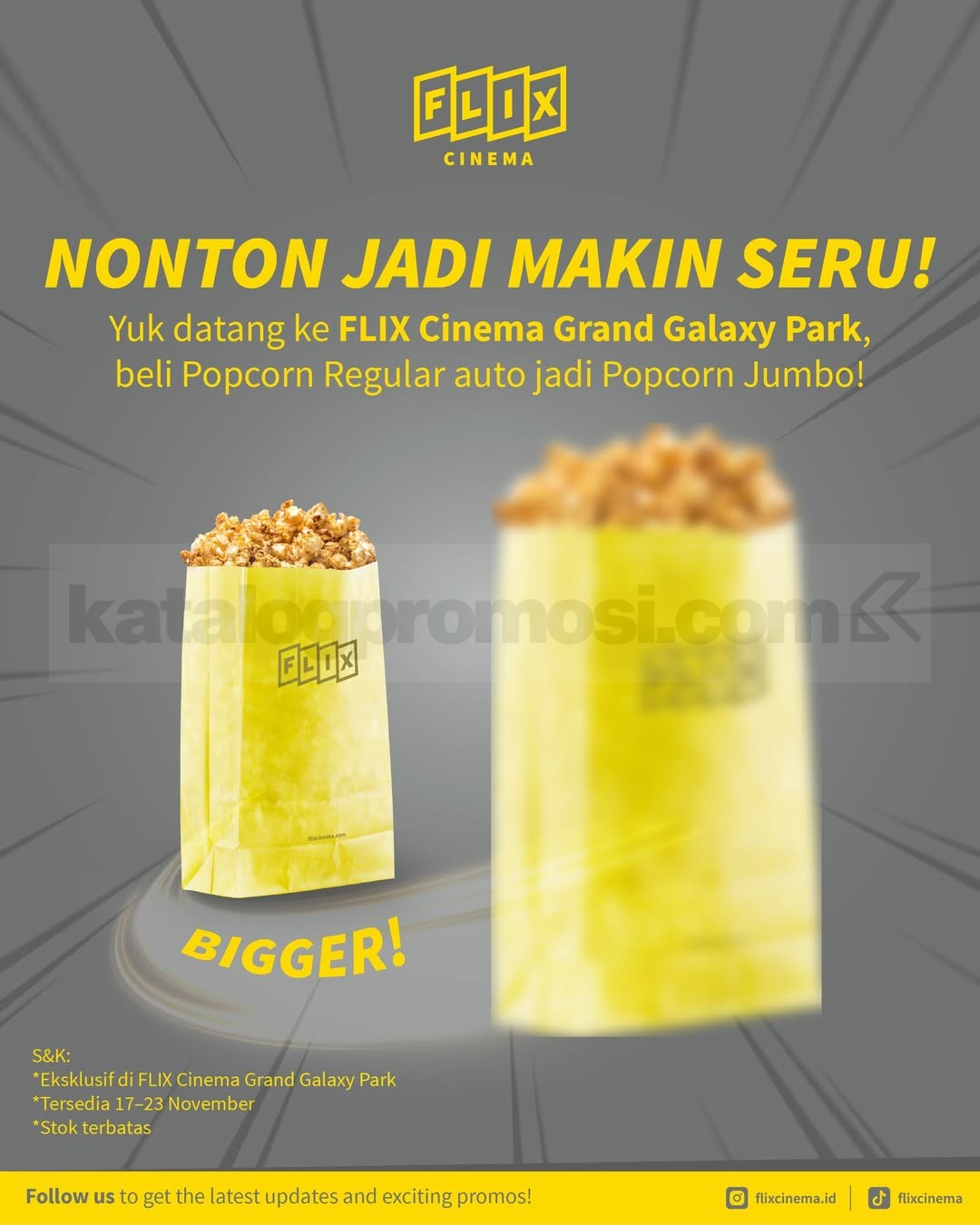 Promo FLIX Cinema Beli Popcorn Regular Auto Jadi Jumbo di Grand Galaxy Park, nikmati popcorn lebih banyak, berlaku 17-23 November 2025