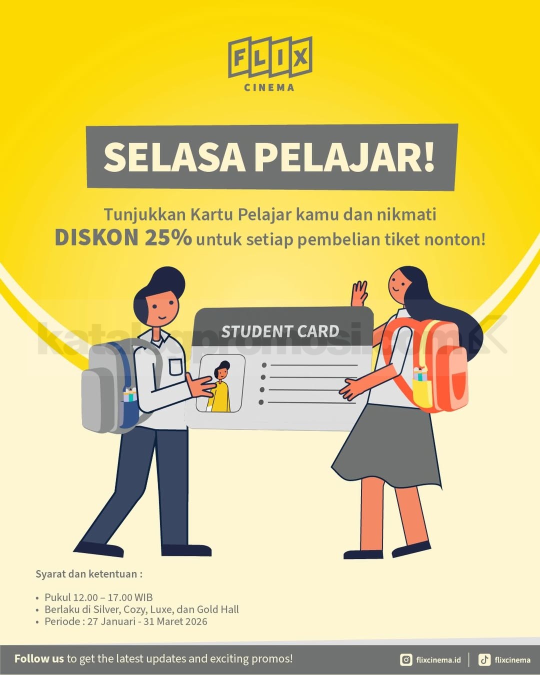 Promo FLIX Cinema Selasa Pelajar Diskon 25% tiket nonton dengan kartu pelajar, berlaku mulai tanggal 27 Januari 2026 – 31 Maret 2026 di lokasi tertentu.