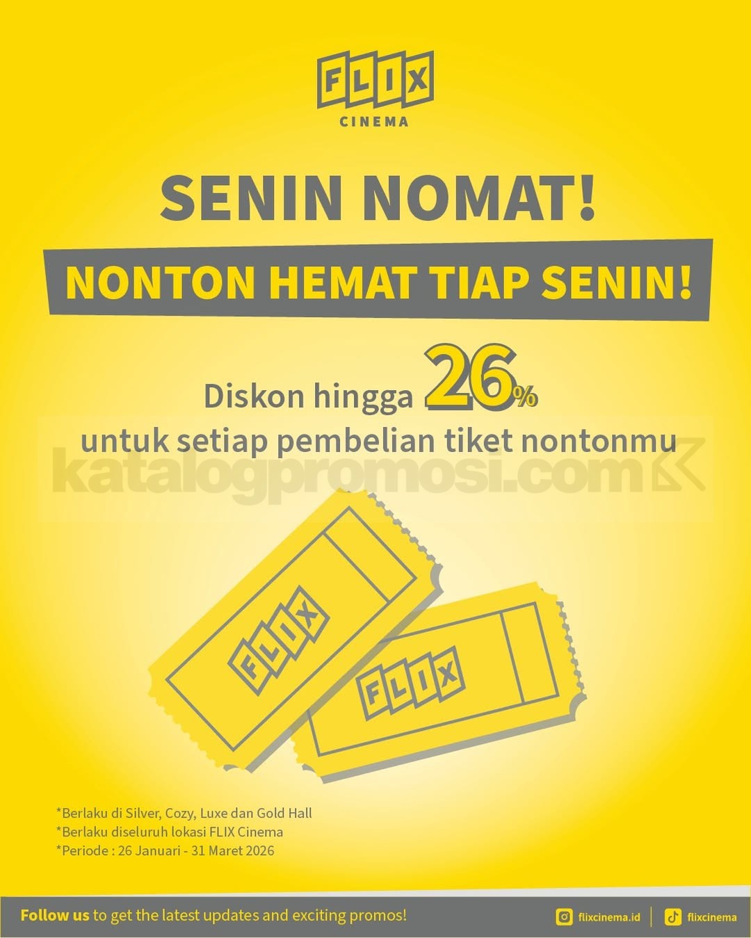 Promo FLIX Cinema Senin Nomat Diskon 26% tiket nonton lebih hemat setiap Senin, berlaku mulai 26 Januari 2026 – 31 Maret 2026 di seluruh FLIX Cinema.