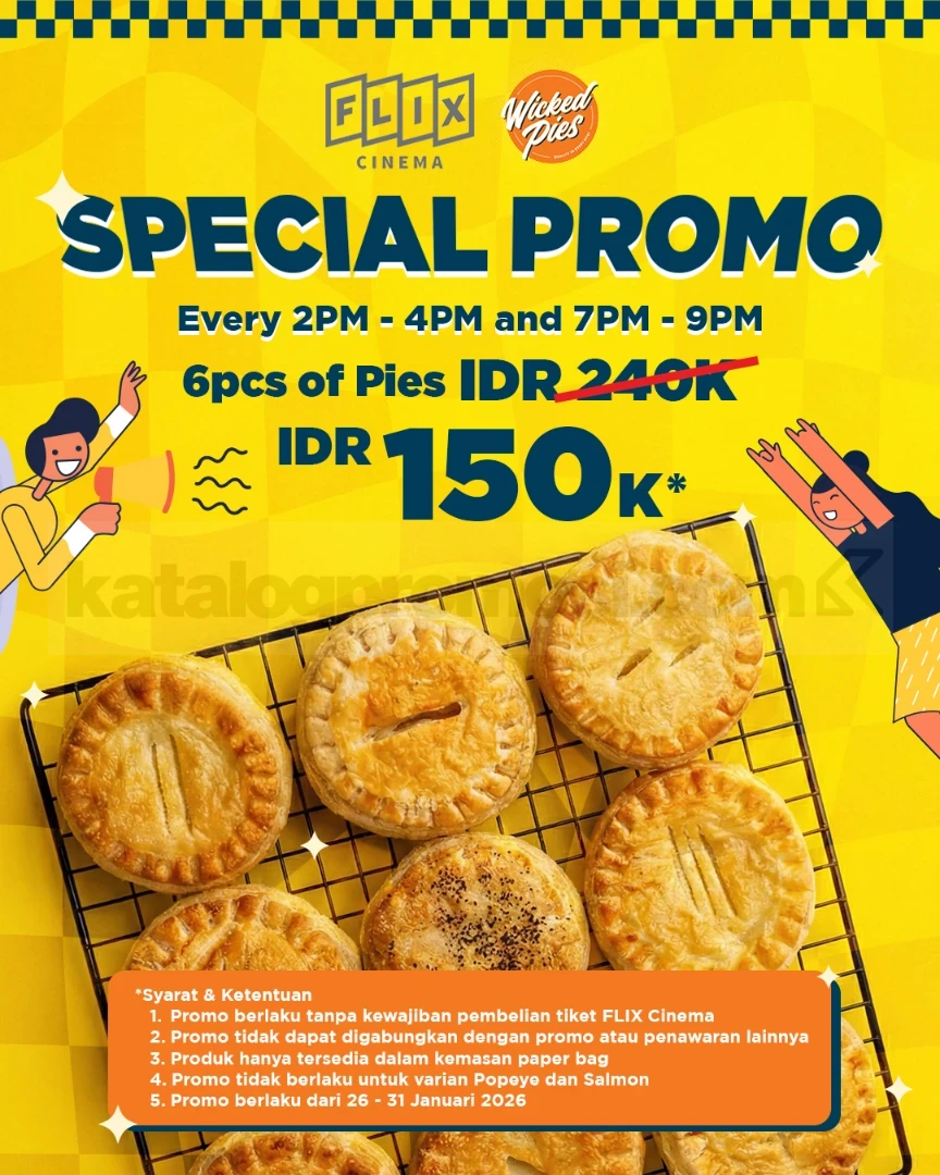 Promo FLIX Cinema x Wicked Pies Special 6 Pies Rp. 150.000 menawarkan paket camilan hemat di jam tertentu, berlaku mulai tanggal 26 Januari 2026 – 31 Januari 2026 di FLIX Cinema Ashta District 8.