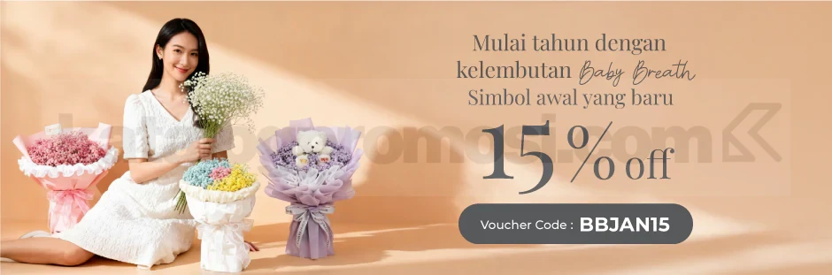 Mulai tahun dengan sentuhan lembut Baby Breath dan buat momen spesial lebih berkesan. Pesan sekarang dan rasakan kemudahan layanan pengiriman cepat FlowerAdvisor ke seluruh Indonesia. Jangan lewatkan kesempatan menikmati diskon 15% dengan kode BBJAN15.