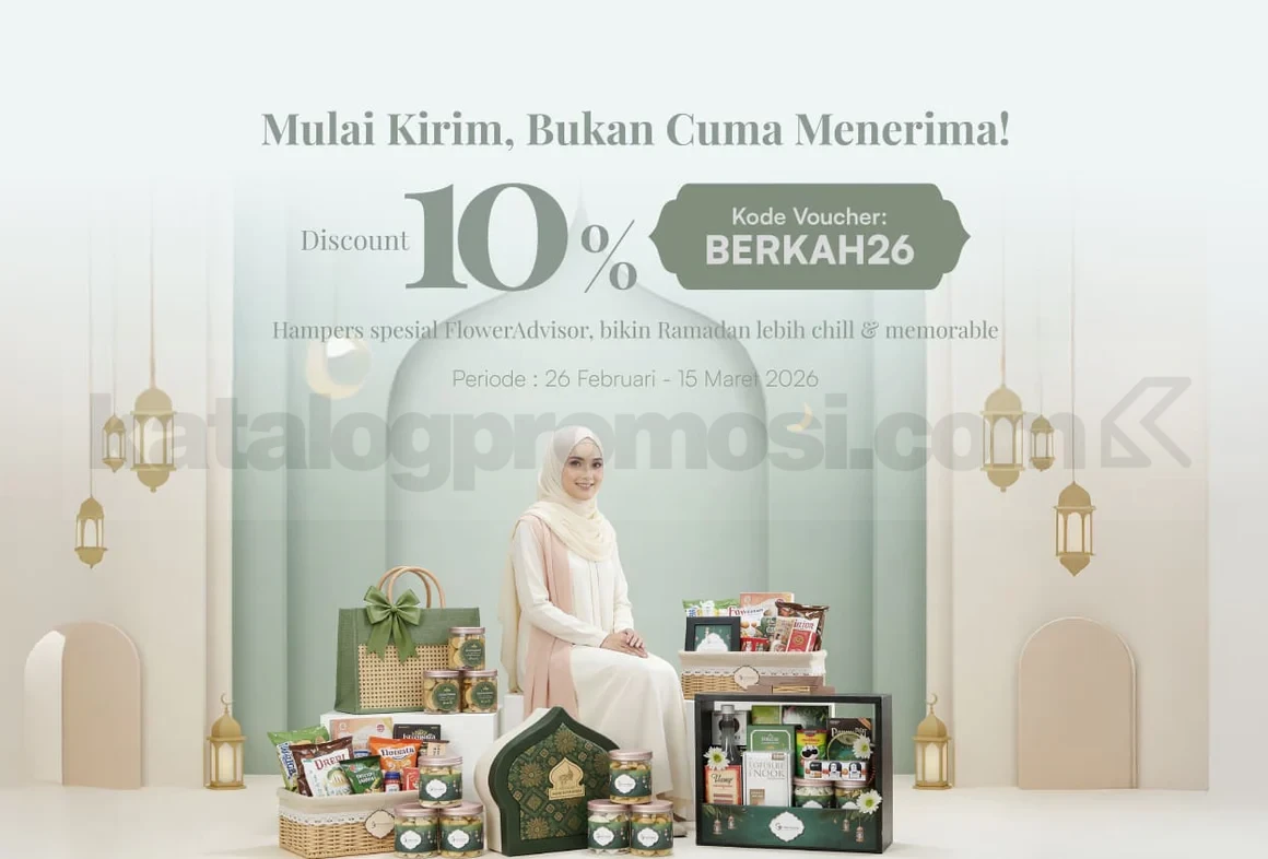 Promo FlowerAdvisor Hampers Ramadan Diskon 10% dengan kode BERKAH26 untuk pemesanan online via aplikasi dan website berlaku mulai tanggal 26 Februari – 15 Maret 2026.