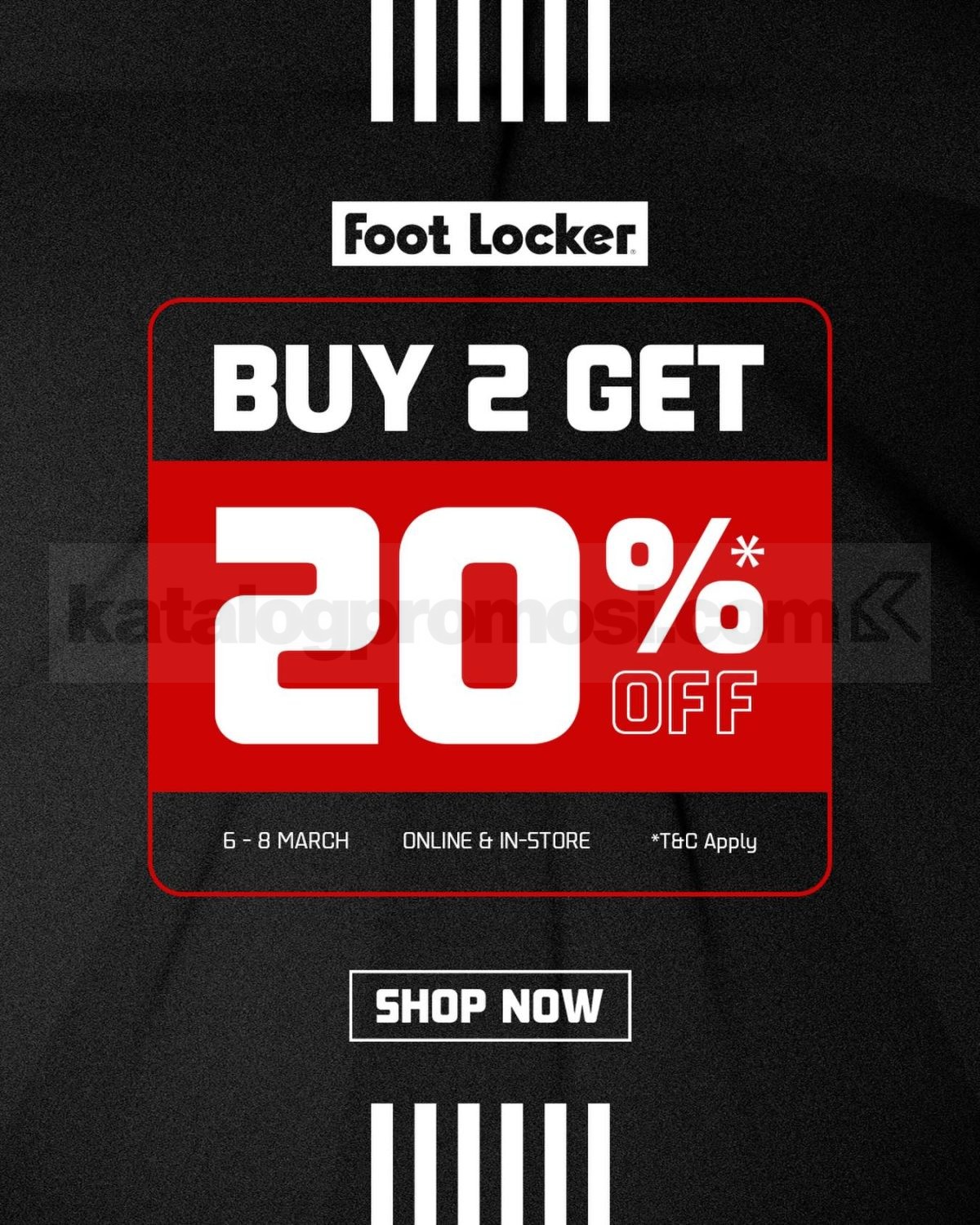 Promo Foot Locker Buy 2 Item Diskon 20% berlaku selama periode 6–8 Maret 2026. Dalam periode tersebut, pelanggan dapat membeli dua produk atau lebih dalam satu transaksi dan langsung menikmati potongan harga 20% untuk item yang dipilih.
