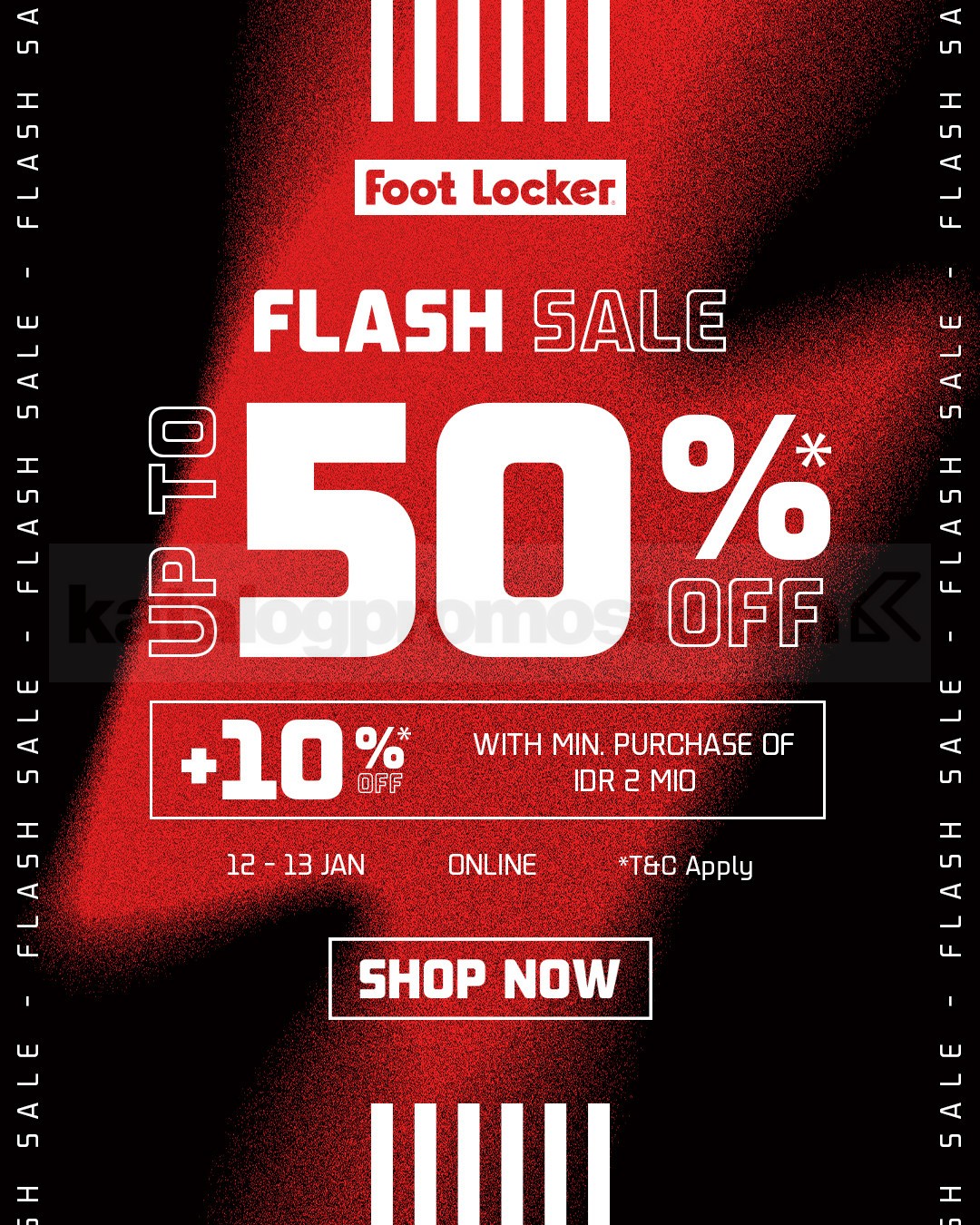 Promo FOOT LOCKER Flash Sale diskon hingga 50% + 10% OFF berlaku tanggal 12 – 13 Januari 2026, belanja online dengan minimum pembelian Rp. 2.000.000.
