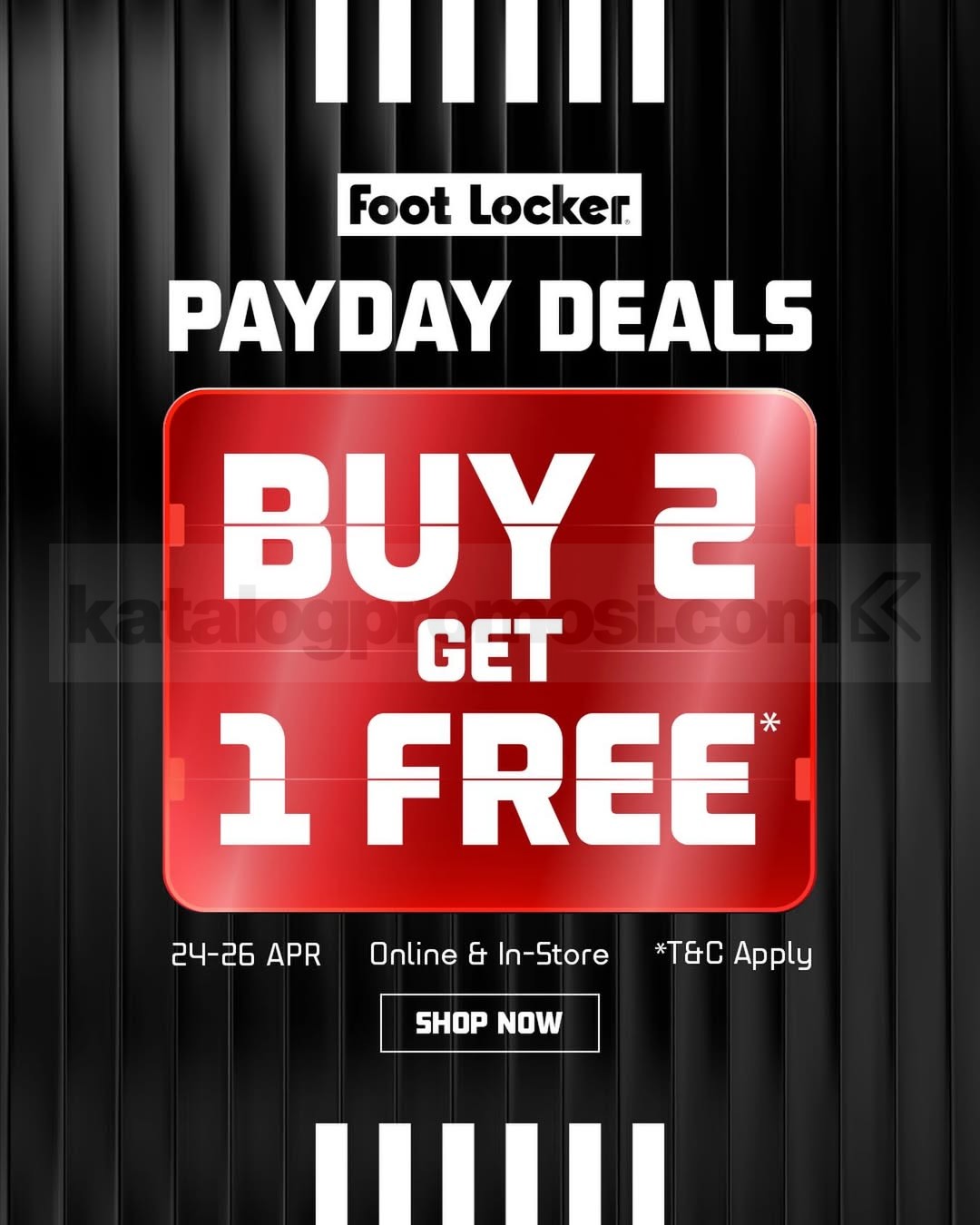 Promo Foot Locker Payday Buy 2 Get 1 Free periode 24 – 26 April 2026 berlaku untuk pembelian online dan in-store di Foot Locker store tertentu selama program berlangsung.
