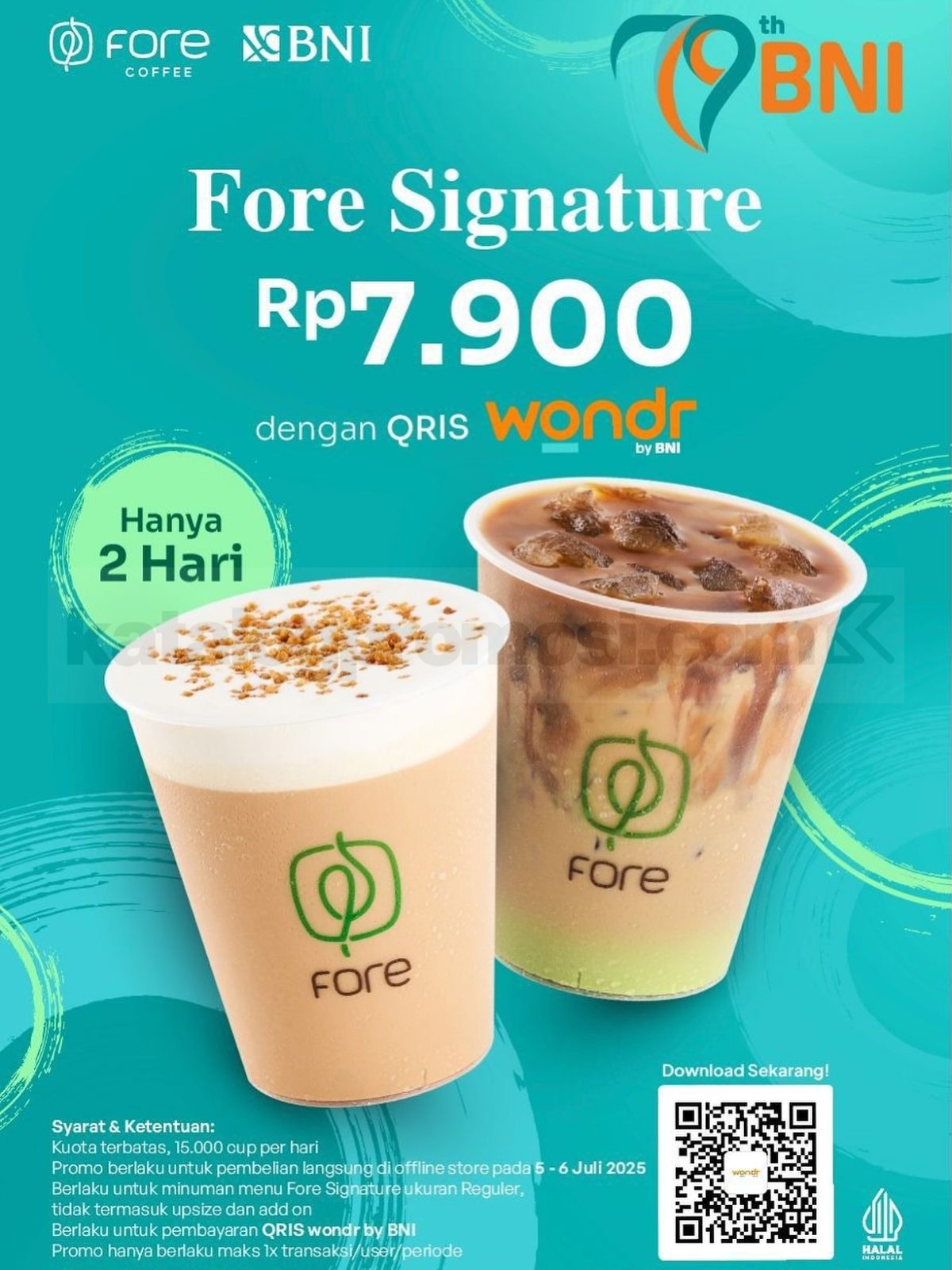 Jangan sampai kelewatan promo Fore Coffee HUT BNI 79, nikmatin Fore Signature cuma Rp7.900 cuma 5-6 Juli 2025 pakai QRIS wondr by BNI di seluruh outlet Fore Coffee!