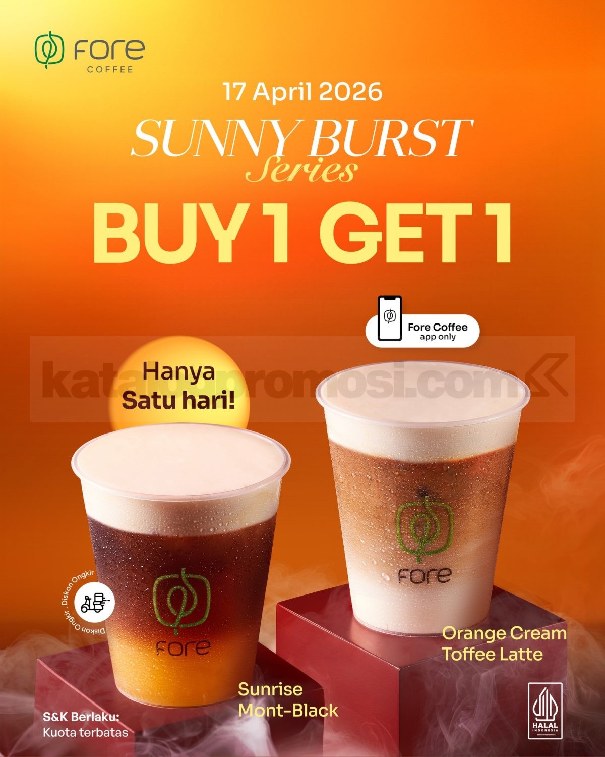 Promo Fore Coffee Sunny Burst Series Beli 1 GRATIS 1 hanya 1 hari, tanggal 17 April 2026 beli 1 GRATIS 1 melalui aplikasi Fore Coffee pada produk dan store berpartisipasi