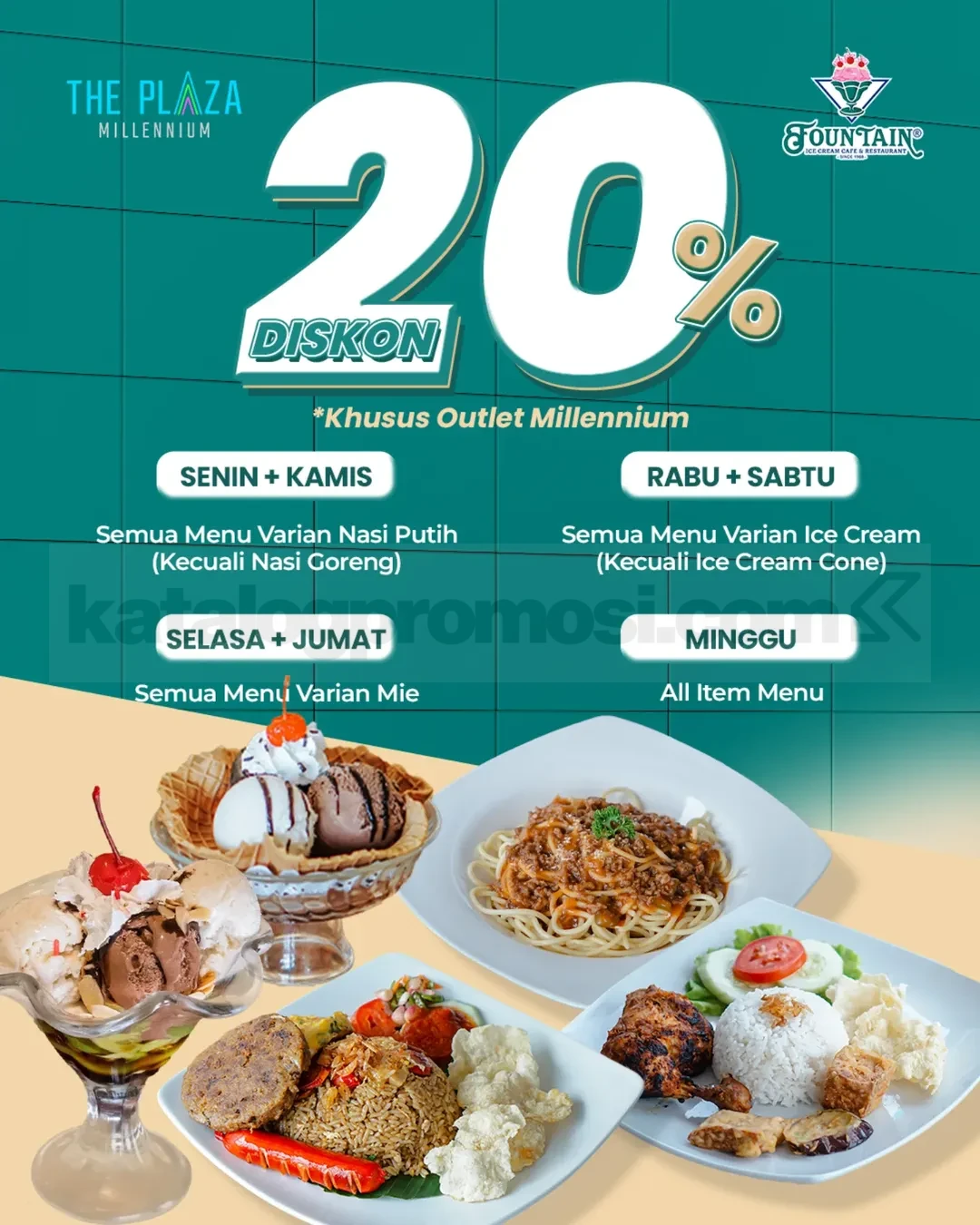 Yuk, manfaatkan Promo Fountain The Plaza Millennium Diskon 20% dan nikmati berbagai menu favorit dengan harga lebih hemat sesuai hari pilihanmu!