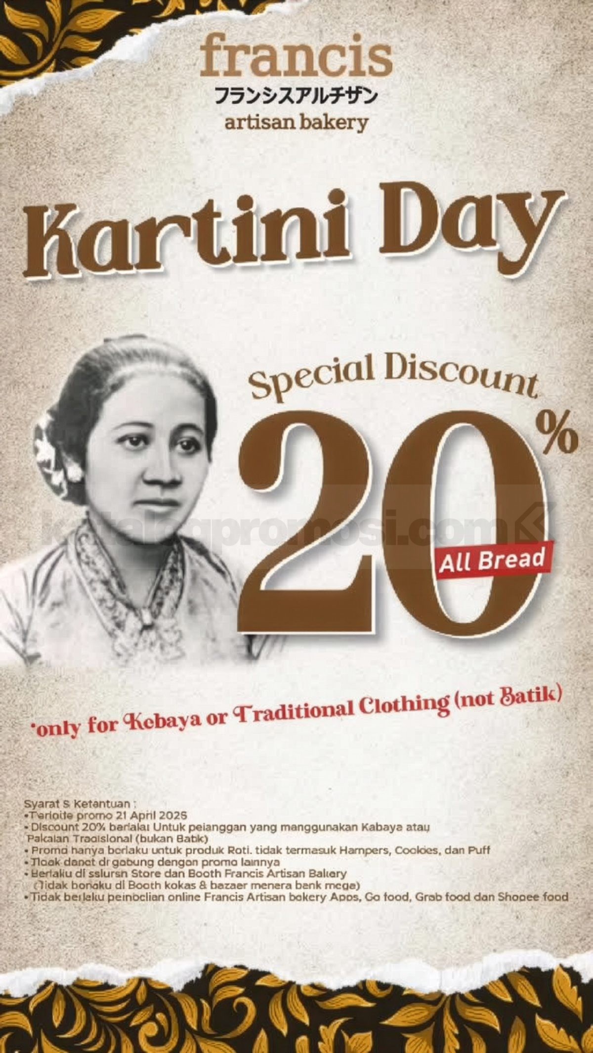 Promo Francis Artisan Bakery Hari Kartini Diskon 20% berlaku saat melakukan pembelian produk roti minimal Rp.100.000 menggunakan kebaya atau pakaian daerah melalui transaksi langsung di store Francis Artisan Bakery sesuai ketentuan program.